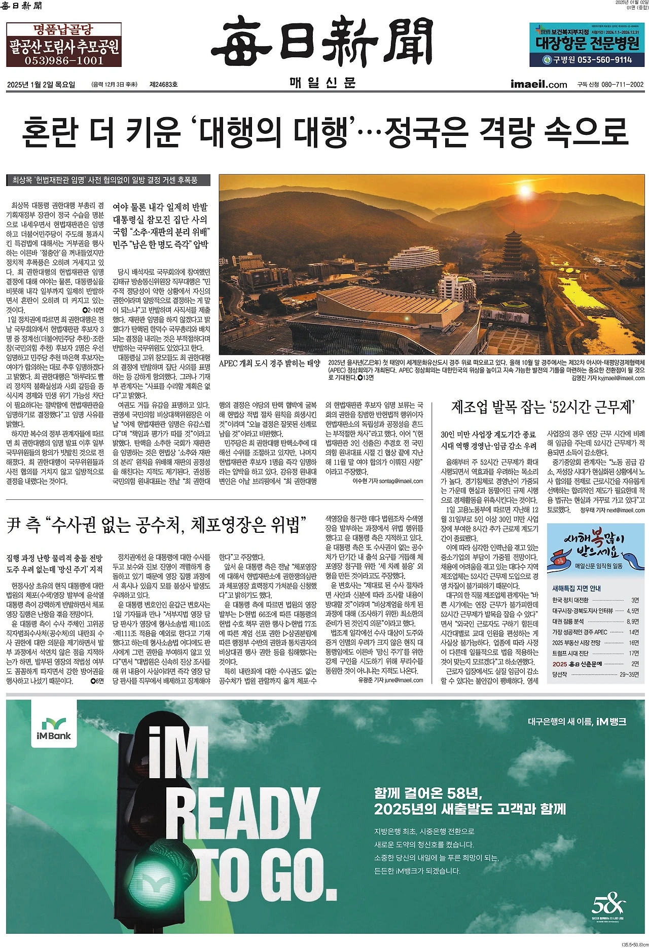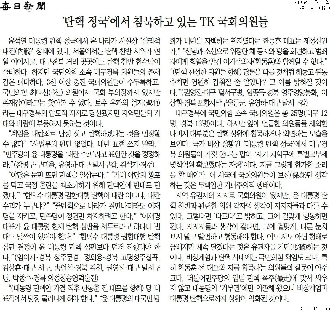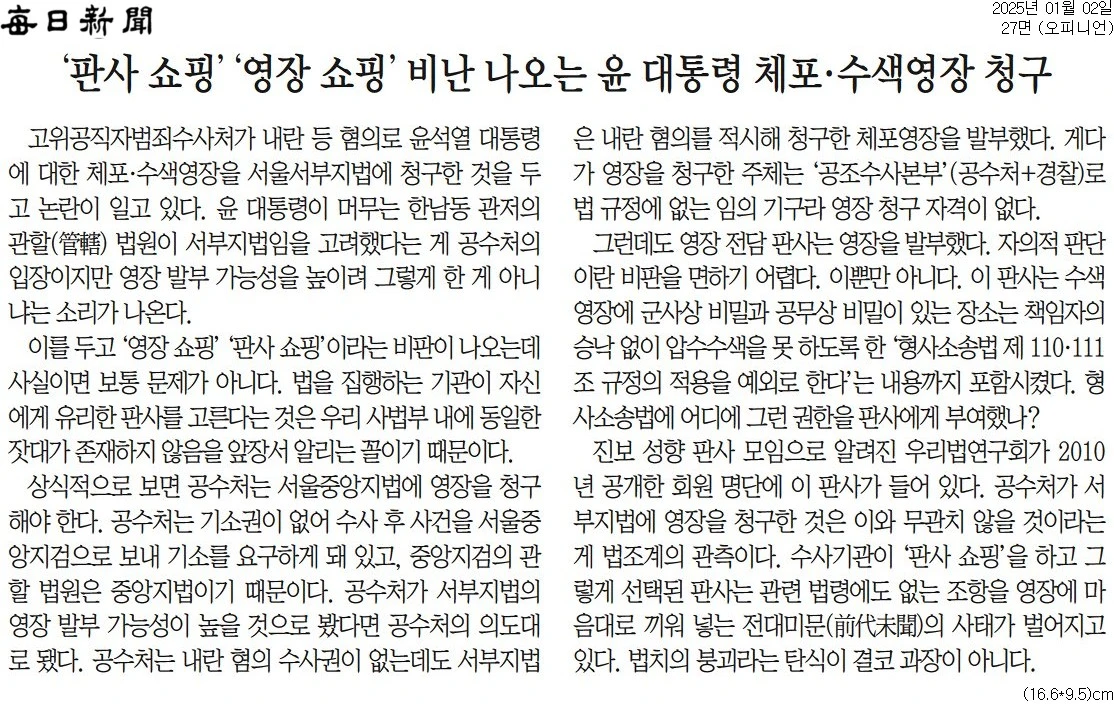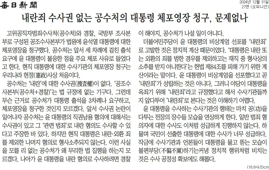 오늘도 꿋꿋이 공수처와 법원의 법 집행을 비난 공격하며, 윤석열 지키기에 앞장선 매일신문. 일관성 만큼은 칭찬해줄만…