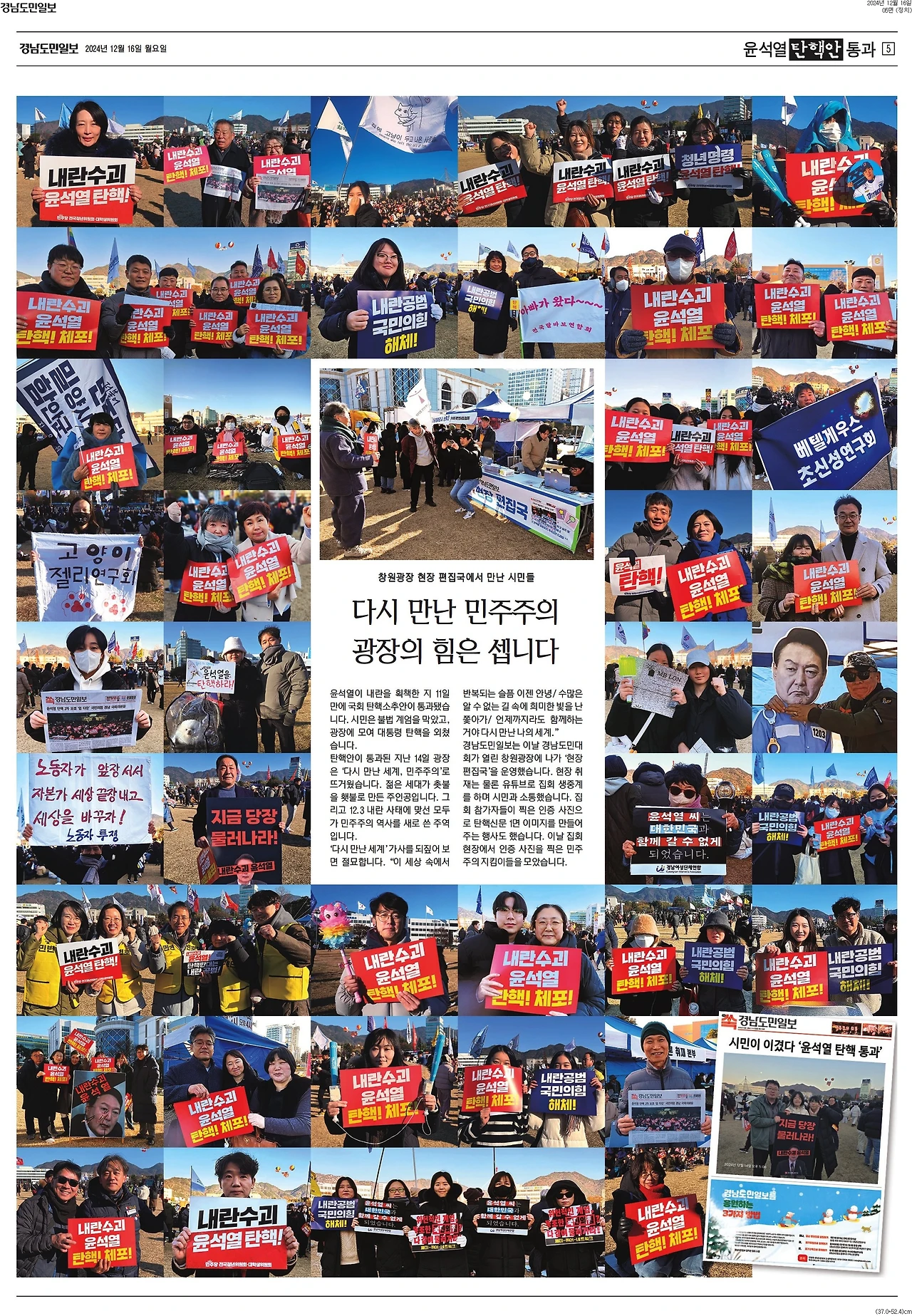 그러나 이들 집회를 보도하는 언론은 경남도민일보밖에 없다. 지역방송의 카메라도 서울로만 향해 있다.(MBC경남이 경남 국회의원 7명을 따라가 한남동 관저 앞을 찾아간 이유를 따져 묻는 기획은 좋았지만) 지역시민들의 집회에는 무관심한 듯하다. 다른 신문들은 말할 것도 없다. 경남에서 가장 대규모로 열리는 창원광장 집회를 실시간 라이브로 중계해 주는 곳도 경남도민일보 유튜브가 유일하다. 경남도민일보가 없었다면 2024~2025 겨울, 경남에는 아무 일도 없었다고 역사에 기록될 것이다.