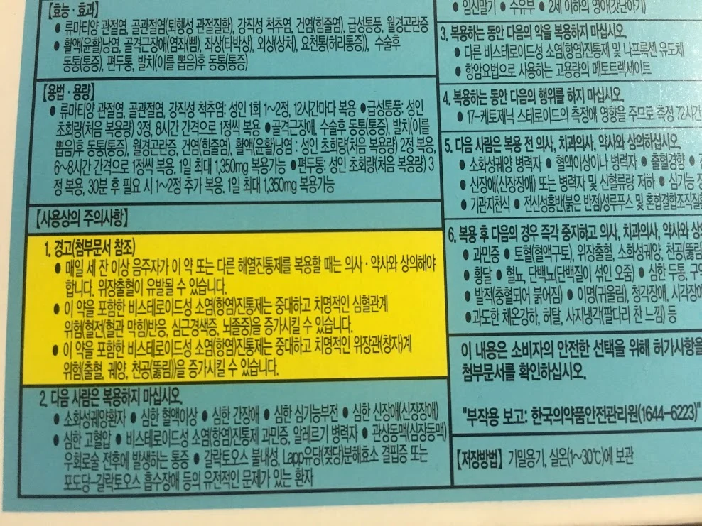 화요일 아침 일어났지만 위통은 더 심해졌다. '약을 잘 못 먹었나?'하는 생각이 들어 어제 먹은 약이 들어 있던 종이곽을 살폈다. 그런데 종이곽에 적혀있는 약의 이름과 그 안의 내용물이 달랐다. 자세히 살펴보니 내가 먹은 약은 속효성 소염(항염) 진통제였다. '사용상의 주의사항'을 살펴보니 '경고'라는 단어와 함께 이렇게 적혀 있었다.
