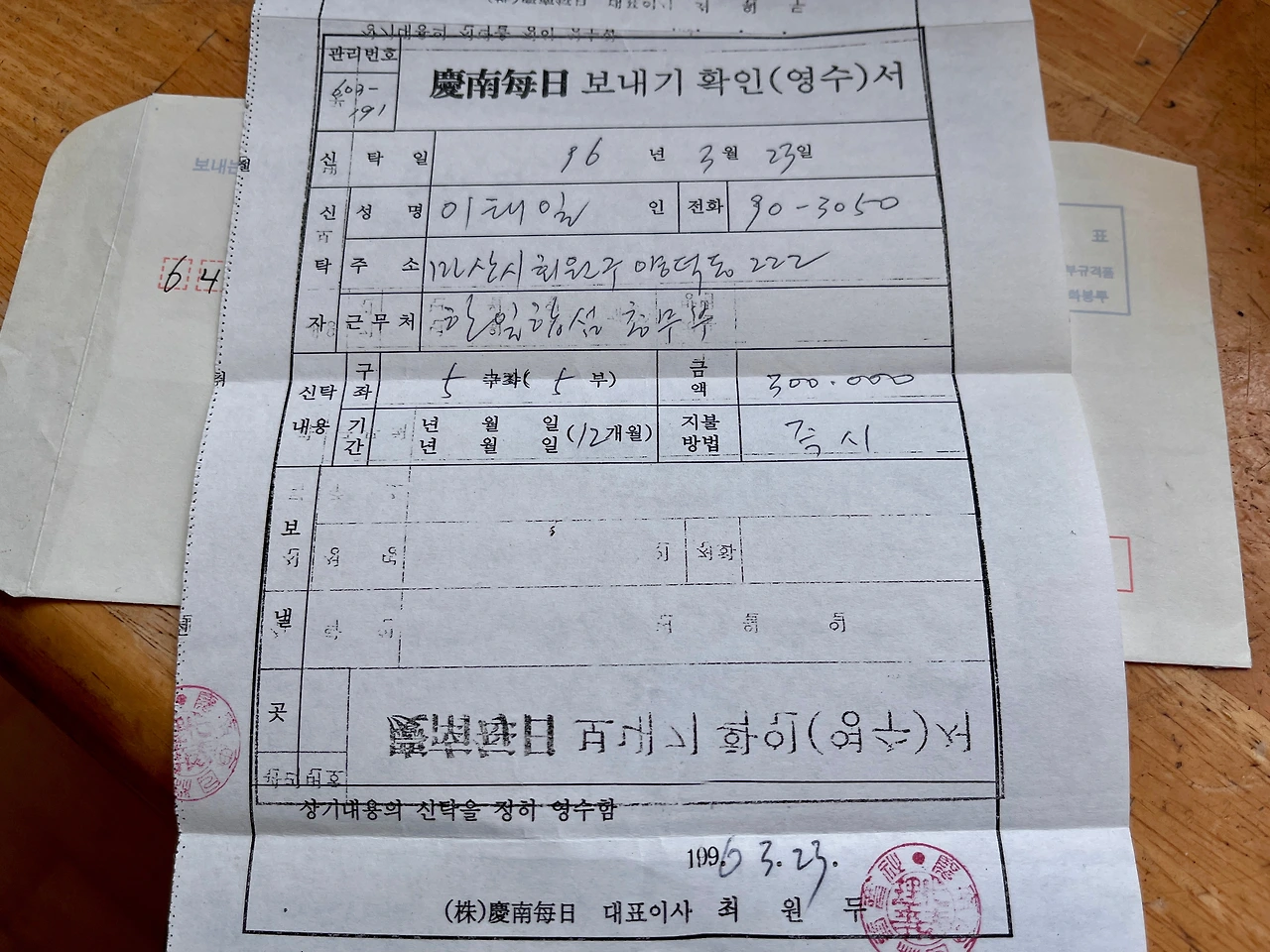 발견된 증서에서 신탁자 명의는 '이태일'이라 되어 있고, 겉봉투를 보니 그는 당시 마산에 있던 (지금은 사라진) 기업 한일합섬의 총무부장이다. 구독 부수는 5구좌 다섯 부, 금액은 30만 원으로 적혀 있는 걸 보니 당시 월 구독료는 6000원이었나 보다. 즉, 월 6000원이지만 1년 구독료를 선납하면 1만 2000원을 할인해 6만 원을 받았으니 30만 원은 신문 다섯 부를 보낼 수 있는 금액이었던 것 같다.