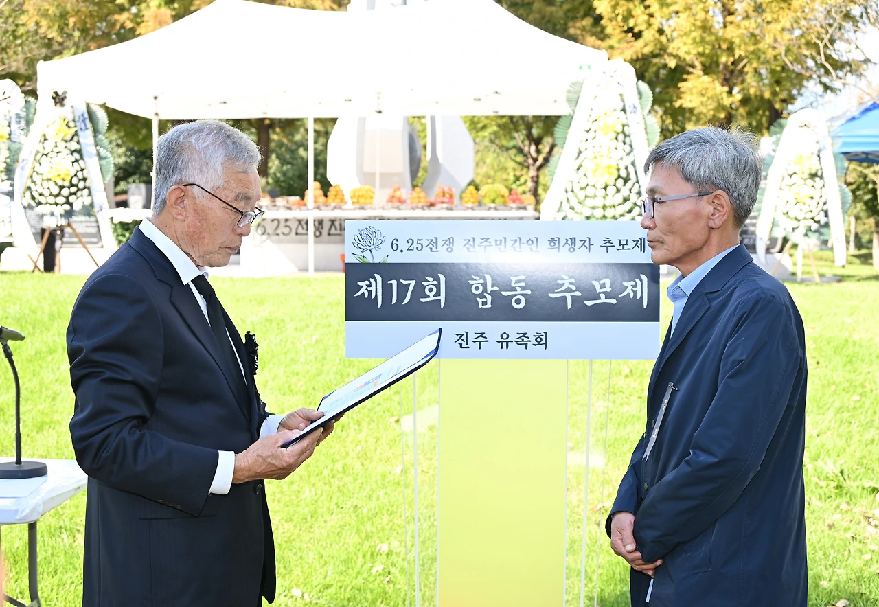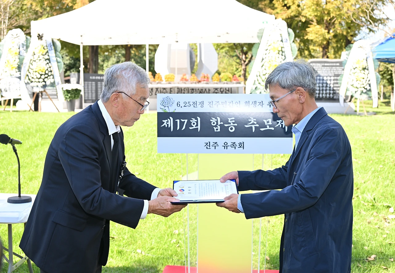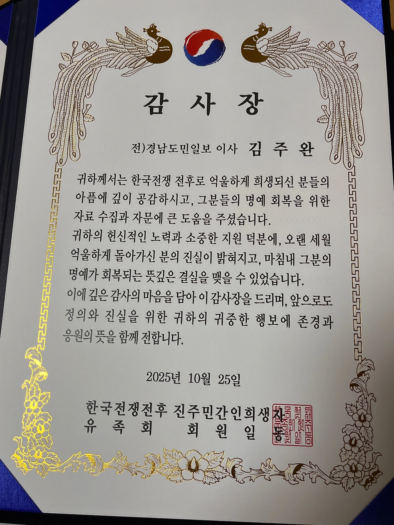 민간인학살 희생자 유족들로부터 감사장을 받았다. 2025년 10월 25일 오후 1시 진주 초전공원 추모비 앞에서 열린 '한국전쟁전후 진주민간인희생자유족회'(회장 정연조, 사무국장 이증식) 제17회 합동추모제 자리에서였다.