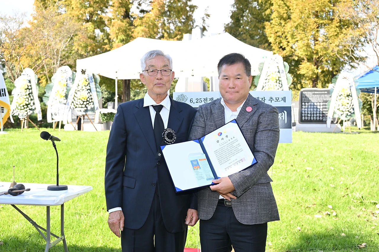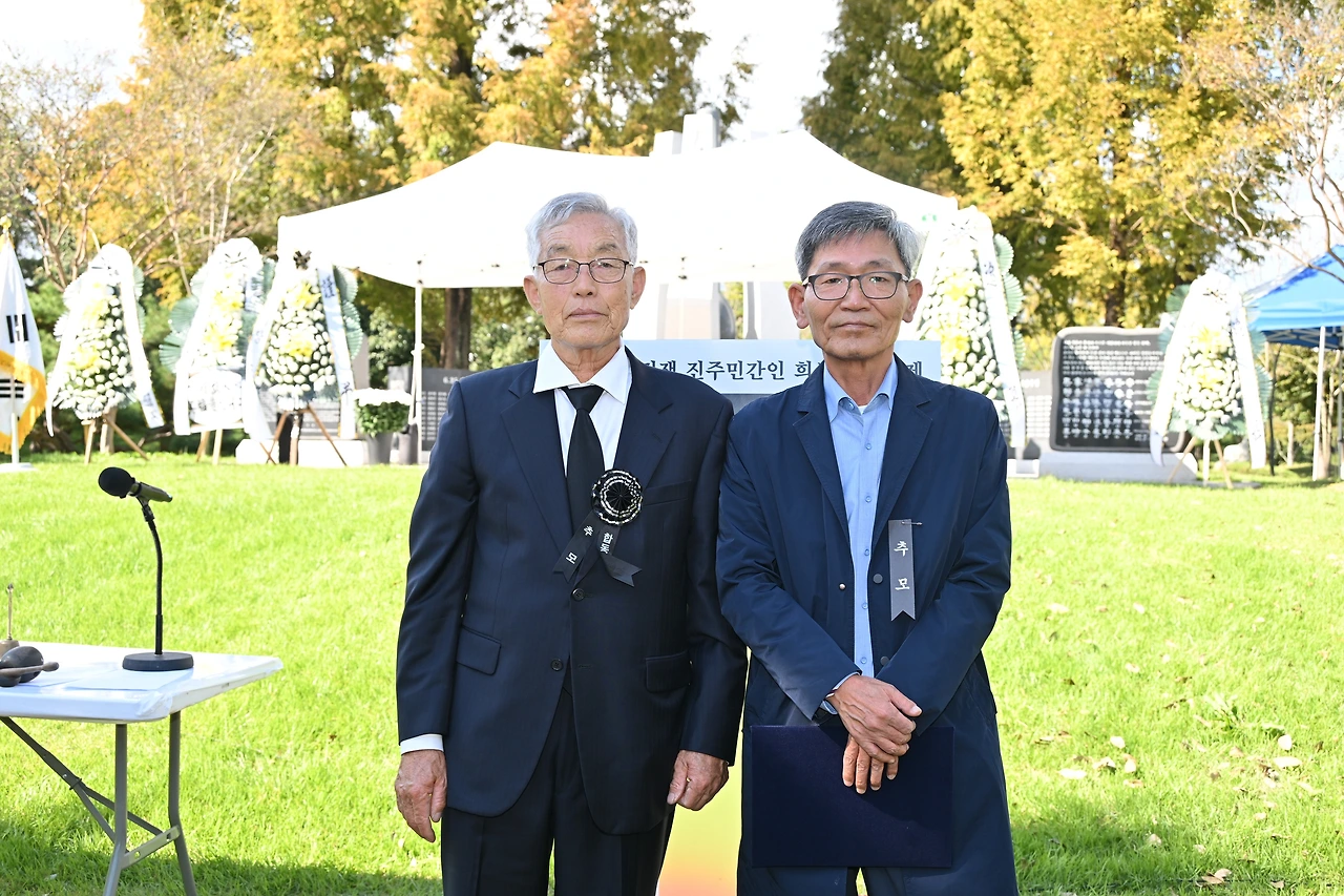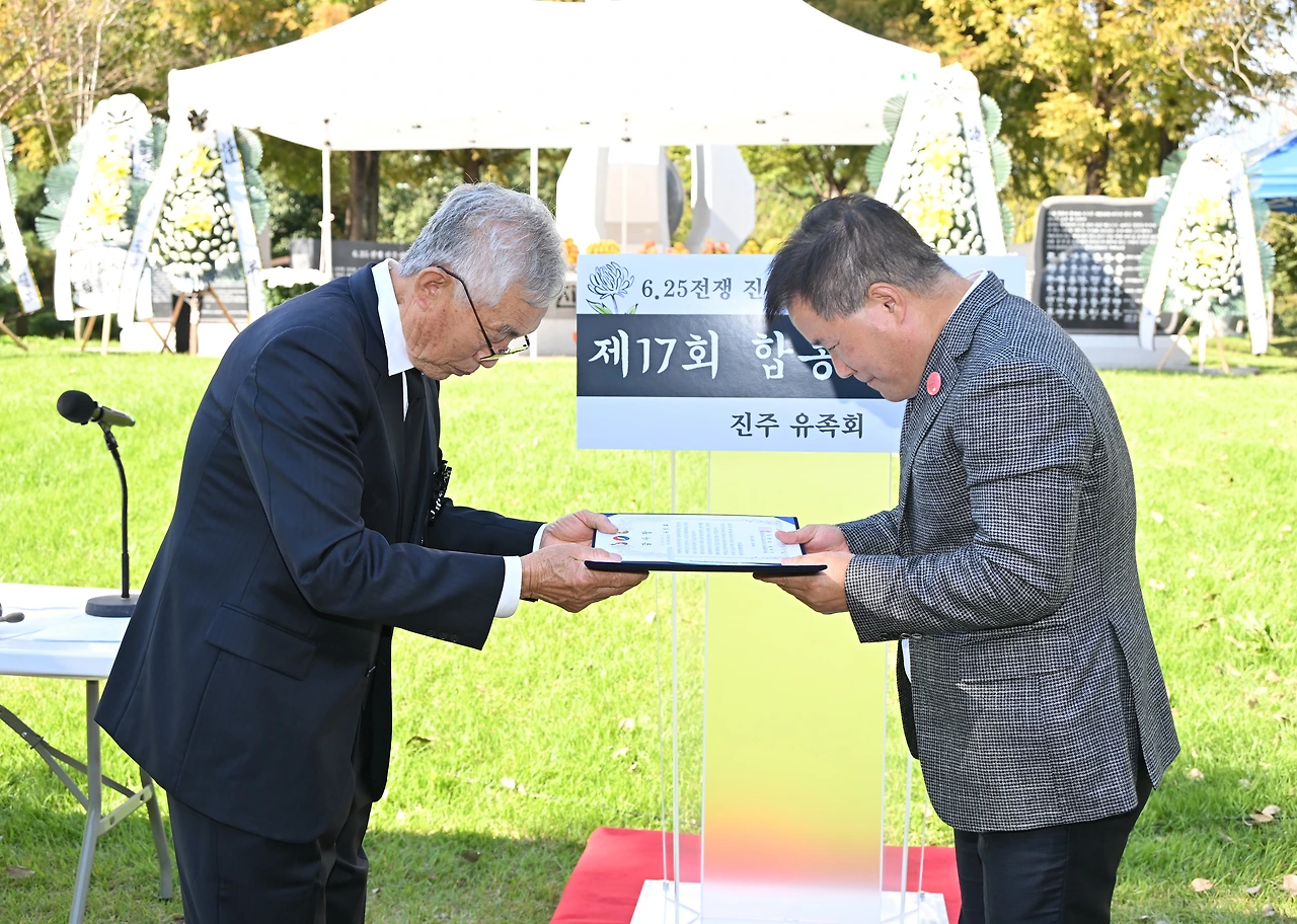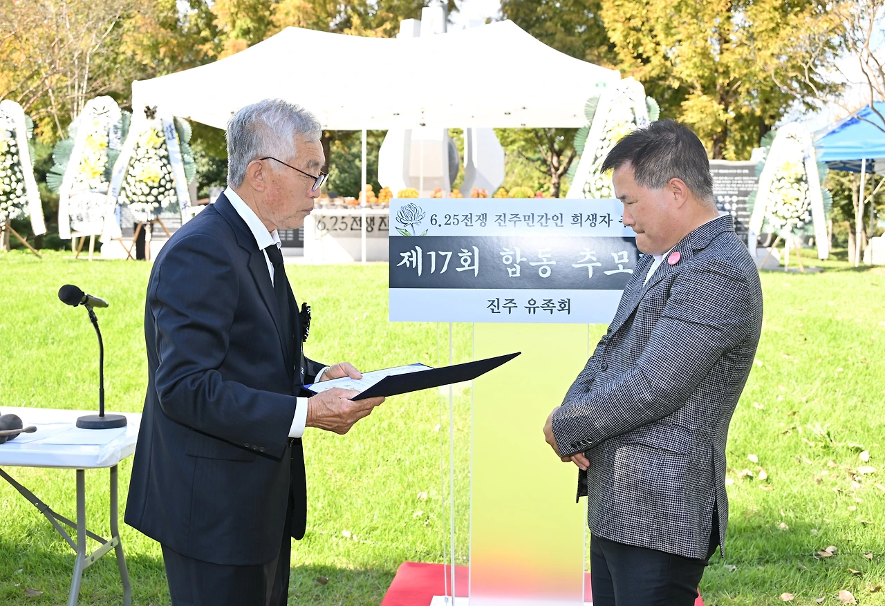 민간인학살 희생자 유족들로부터 감사장을 받았다. 2025년 10월 25일 오후 1시 진주 초전공원 추모비 앞에서 열린 '한국전쟁전후 진주민간인희생자유족회'(회장 정연조, 사무국장 이증식) 제17회 합동추모제 자리에서였다.