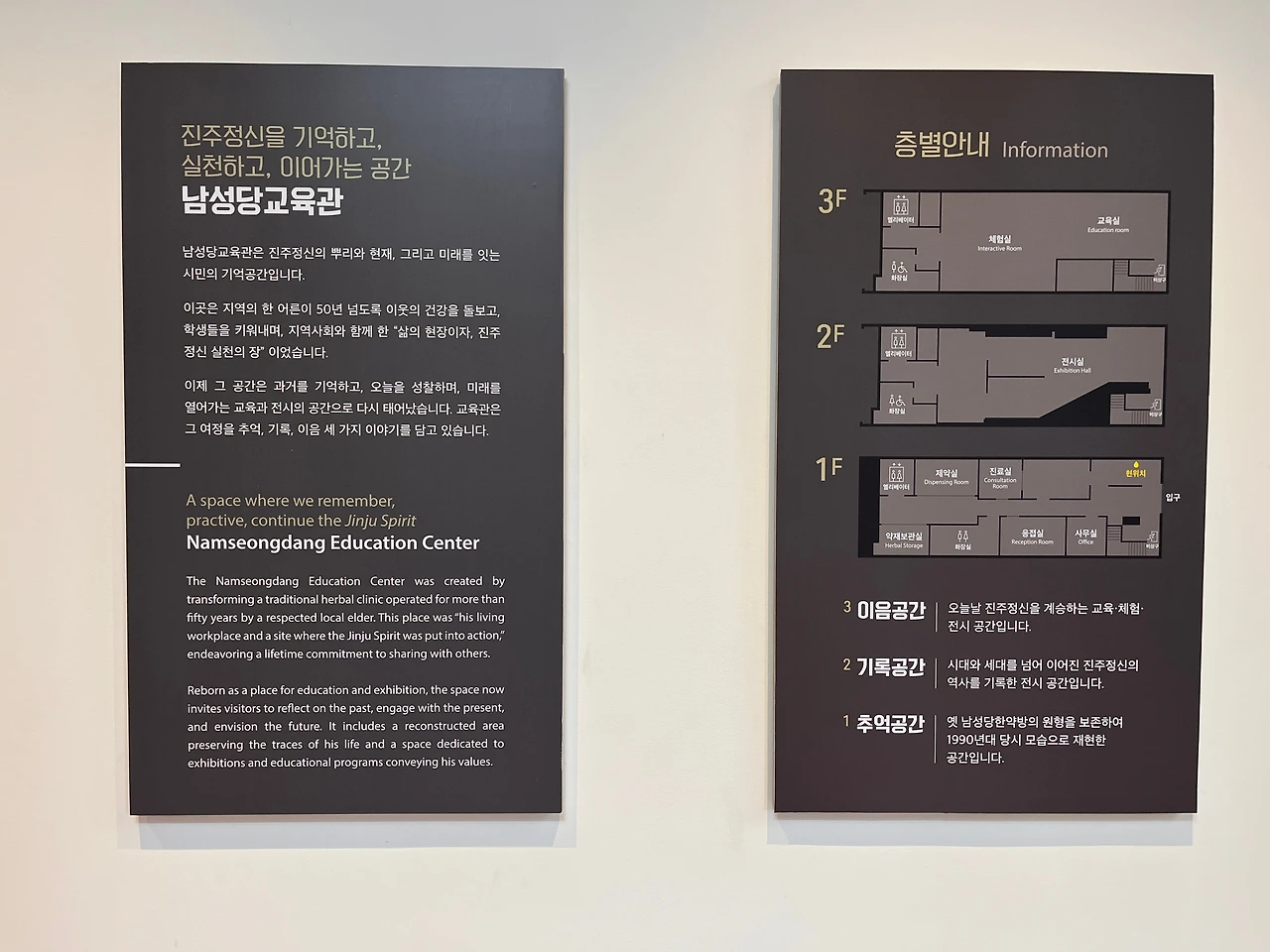 1층은 점차 사라져가는 업종인 한약방의 원형을 그대로 보존하고, 약재실과 선생의 가정집이 있던 2,3층은 진주에서 발원한 형평운동과 소년운동의 역사를 전시 교육하는 공간으로 꾸몄다.