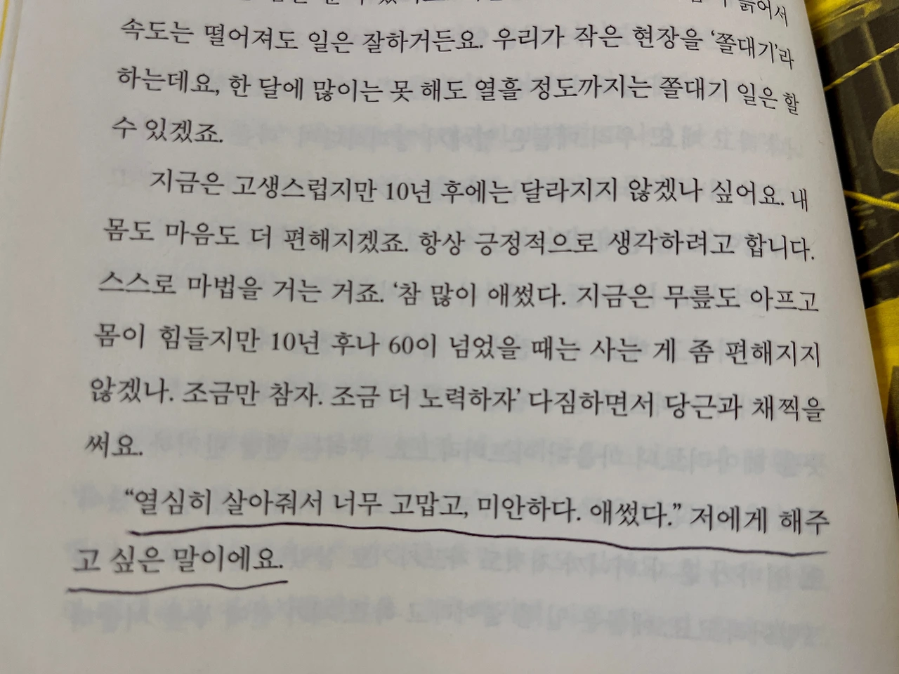 20년 경력의 노동은 그의 온몸에 상처와 골병을 남겼지만, 조금만 참자 다짐하며 이렇게 말한다.