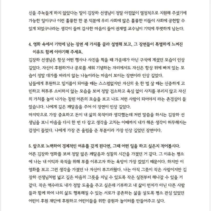 하나하나 읽어가면서 김장하 선생님의 삶이 청소년들에게도 이렇게 큰 울림을 줄 수 있구나 싶어 참으로 뿌듯하고 다행이라는 생각이 들었습니다. 여느 어른들보다 청소년들 생각이 깊어 대견하기도 하고요.