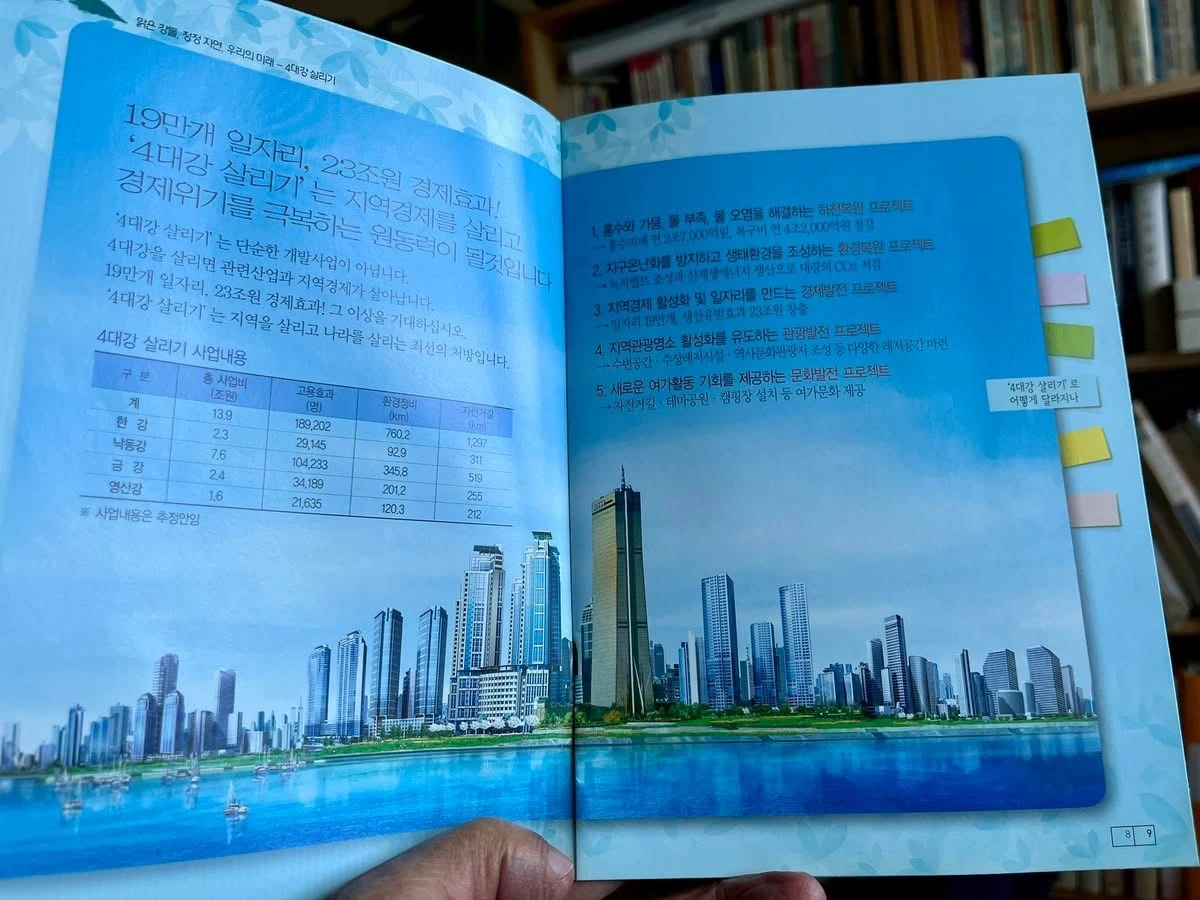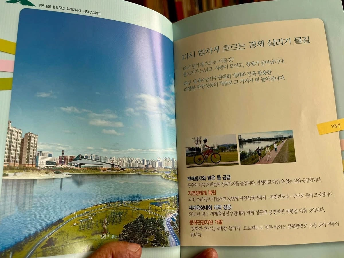이명박의 4대강 사업은 과연 이 홍보물처럼 경제와 환경 모두를 살렸나. 지역관광명소를 만들고 지역경제를 활성화했을까?