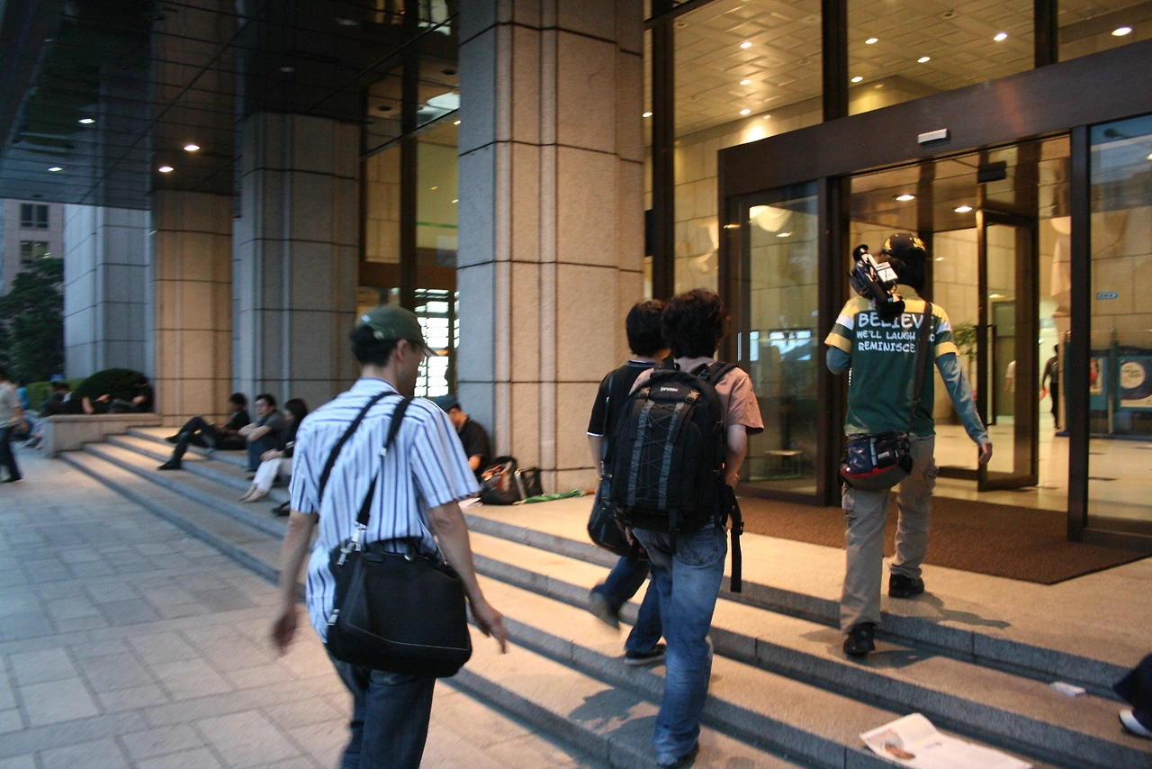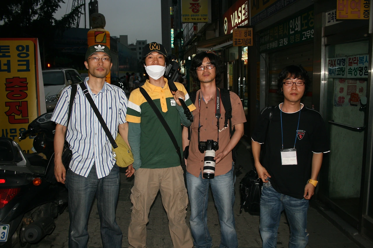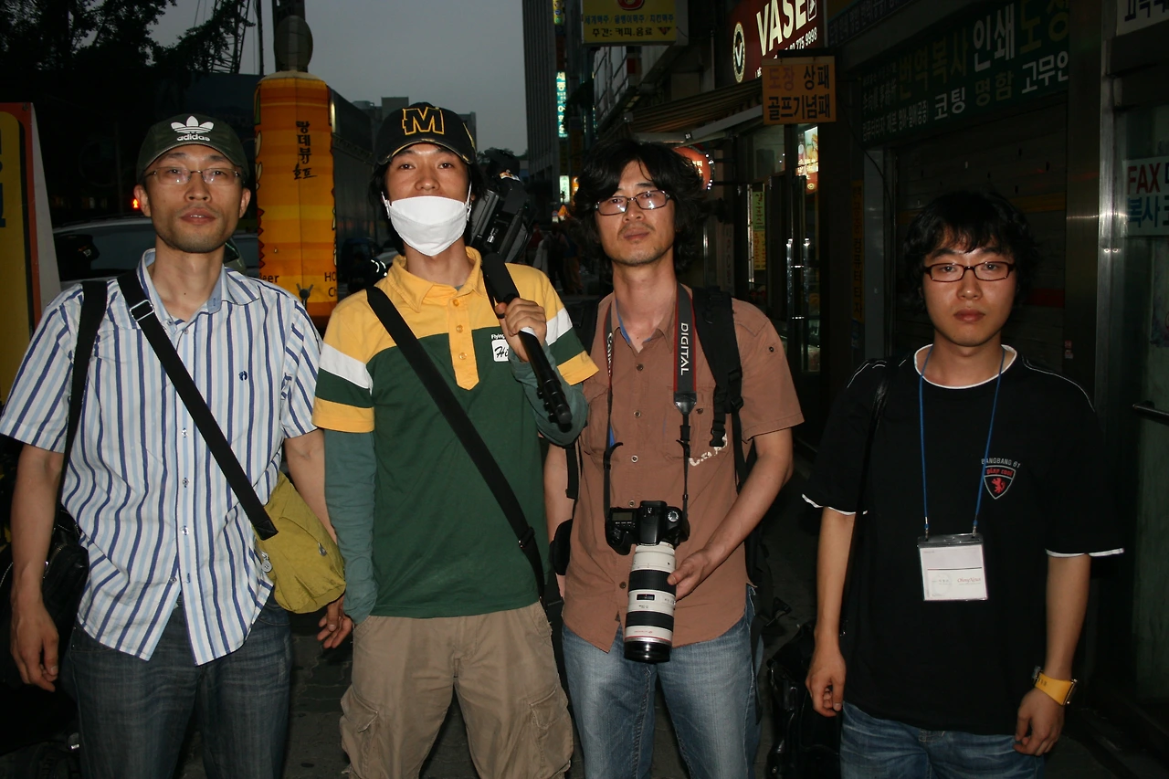 보낸메일함에서 찾은 사진이다. 서울 광화문 광우병 쇠고기 촛불집회를 취재하던 블로거 커서(김욱), 미디어몽구(김정환), 달리(이용한), 그리고 박형준 님의 모습을 찍었다. 2008년 6월 28일 저녁 7시 50분이었다. 내가 찍었기 때문에 사진 속에 나는 없다.