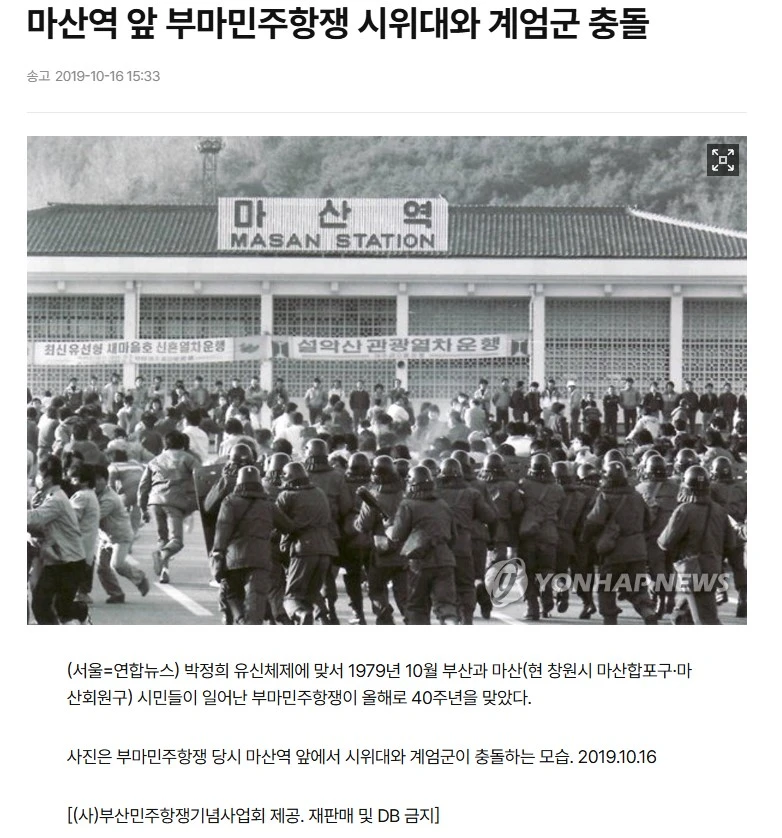 "부마민주항쟁 당시 마산역 앞에서 시위대와 계엄군이 충돌하는 모습"이라는 설명이 붙은 연합뉴스 보도는 명백한 잘못이다. 우선 사진 속에는 '계엄군'이 없다. 진압복을 입은 경찰이다.