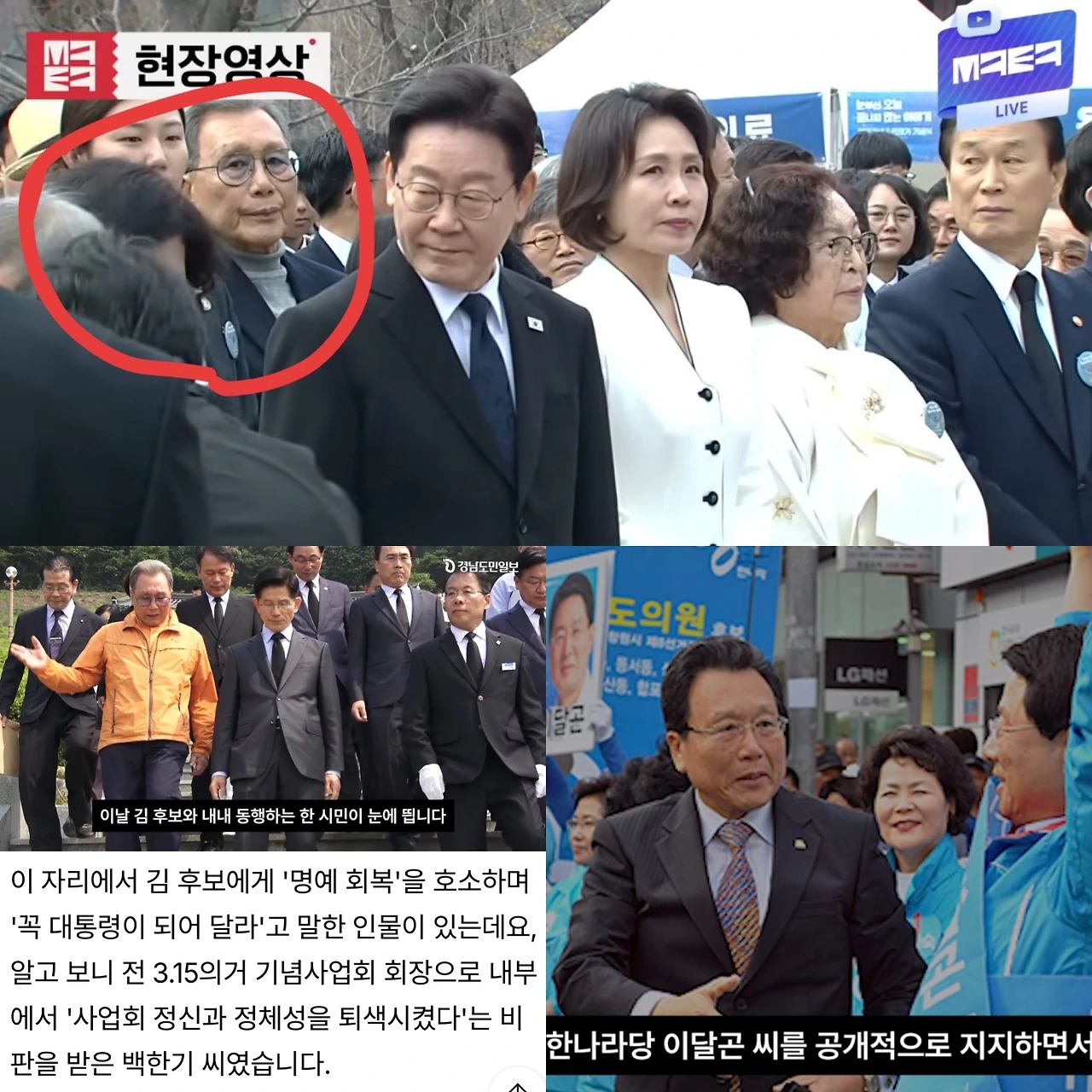 또 한 명의 노인이 눈에 띄었는데요. 그 역시 내란정당 김문수 후보에게 "꼭 대통령이 되어달라"며 공개지지를 천명했던 백한기 전 3.15기념사업회 회장이었죠.