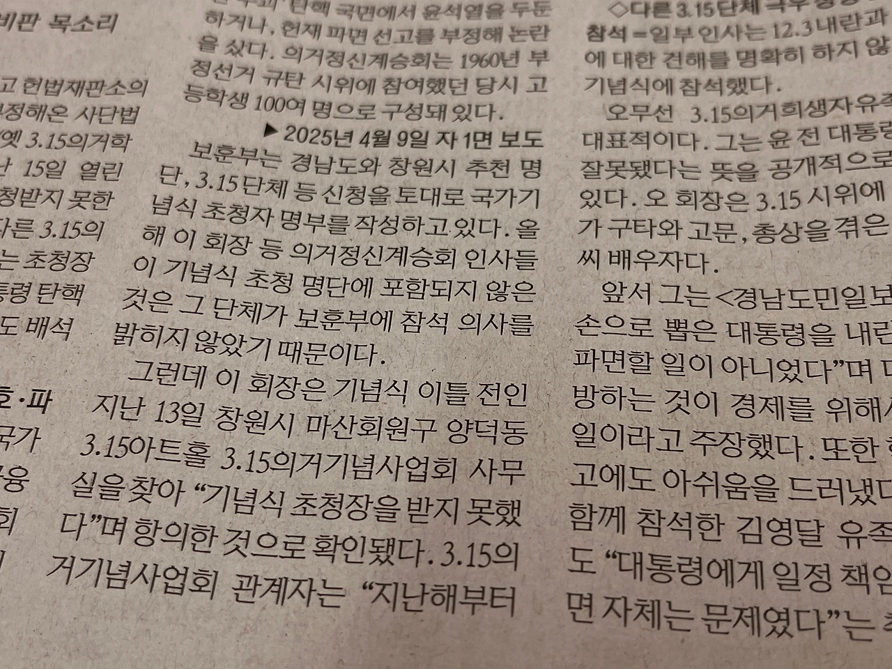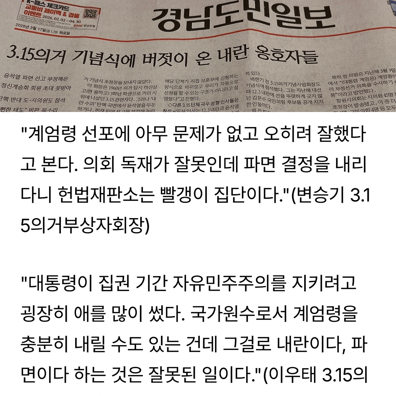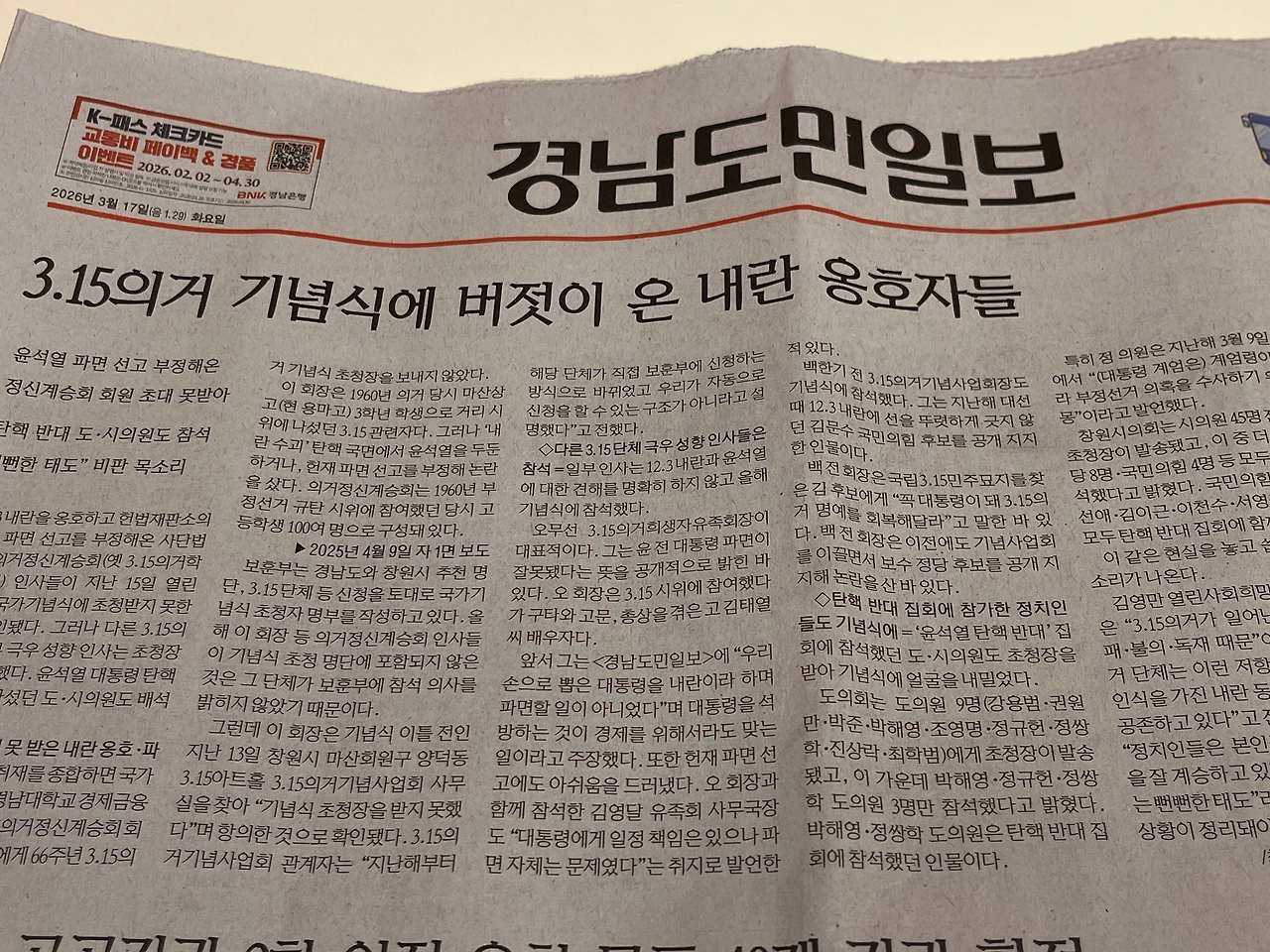 앞서 윤석열 내란을 옹호해 물의를 빚은 오무선 3.15의거희생자유족회장과 백한기 전 3.15의거기념사업회장의 염치없는 행태를 여기에 포스팅한 바 있다. 많은 사람의 공분을 샀는데, 오늘 경남도민일보에도 관련 기사가 1면에 나왔다.