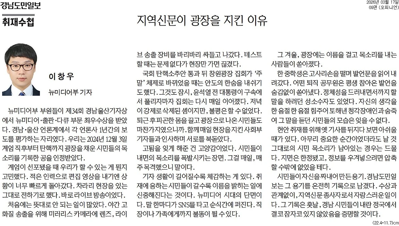 맞다. 경남에도 수많은 신문과 방송이 있지만, 지역의 촛불과 응원봉을 빠짐없이 중계해준 곳은 경남도민일보뿐이었다.