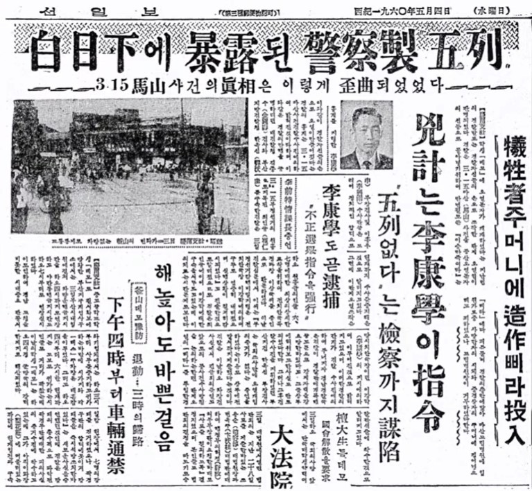 경찰은 이승만 정권의 부정선거를 규탄하는 시위군중에게 총을 쏴 3월 15일 하루 사이에 9명의 시민을 죽였다. 다음날인 16일 최인규 내무부장관은 진상발표를 통해 "데모군중의 사인은 압사인지 총사인지 모르겠다"고 뜬금없는 소리를 늘어놓았다.