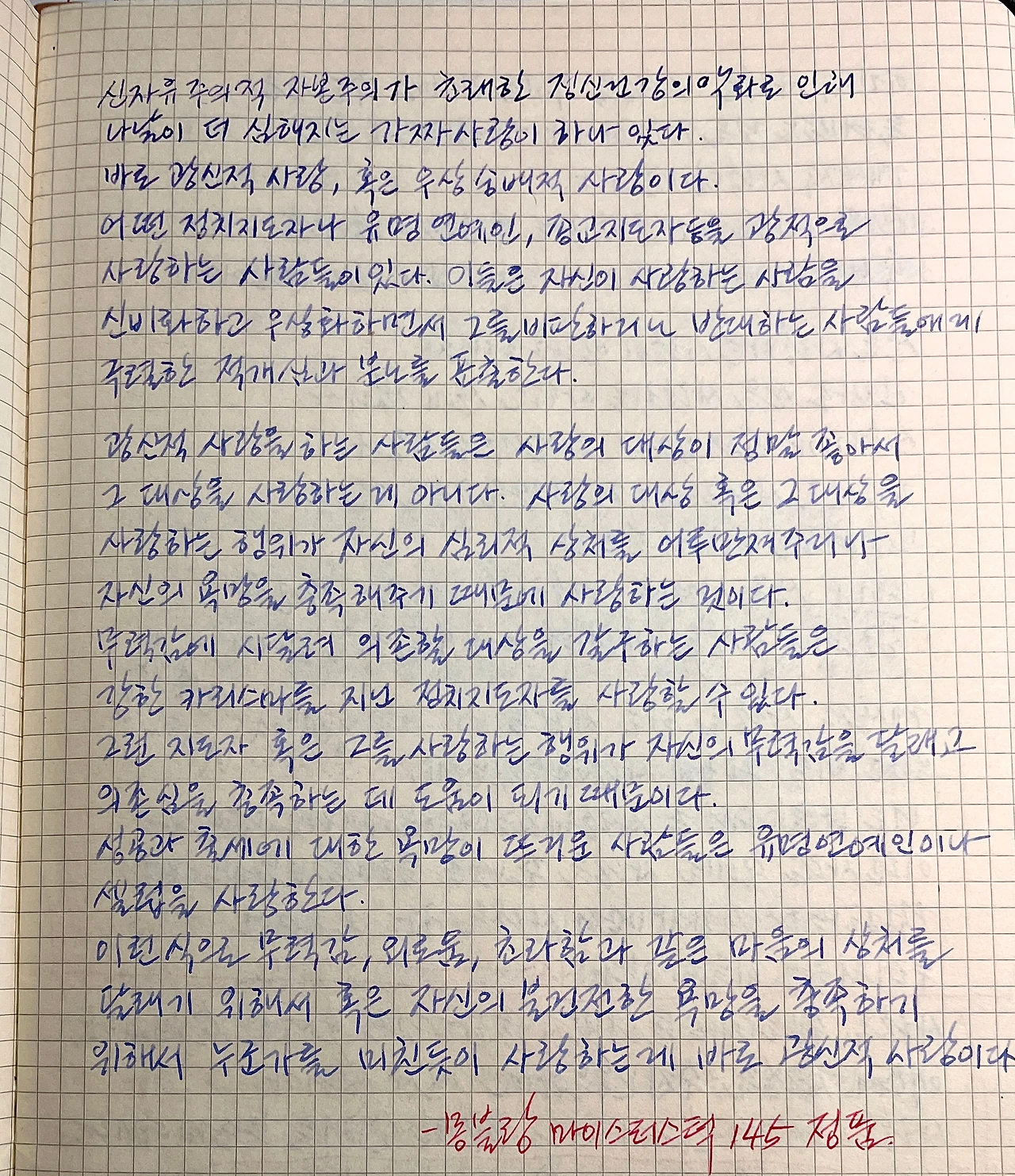 광신적 사랑을 하는 사람들은 사랑의 대상이 정말 좋아서 그 대상을 사랑하는 게 아니다. 사랑의 대상 혹은 그 대상을 사랑하는 행위가 자신의 심리적 상처를 어루만져주거나 자신의 욕망을 충족해주기 때문에 사랑하는 것이다.
