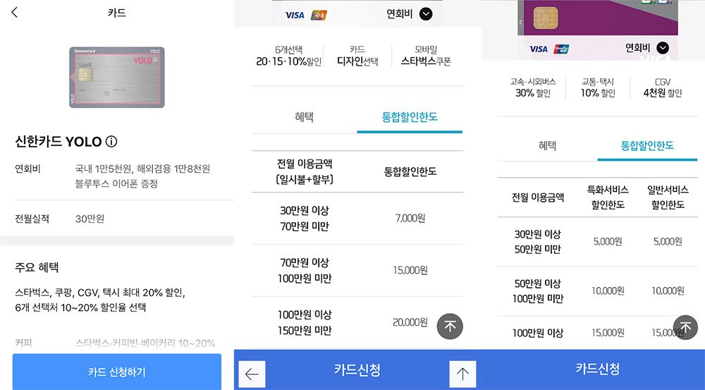 위의 캡처 이미지처럼 신한카드에도 택시비가 무려 20%까지 할인되는 카드가 있지만, 통합할인한도를 보면 전월 사용실적이 70만 원 미만일 경우 통합할인한도는 7000원에 불과합니다. 맨 오른쪽의 신한카드는 택시비 10%, 고속버스와 시내버스는 무려 30%까지 할인해준다고 하지만, 역시 할인한도는 50만 원 이상 사용실적이 있더라도 1만 원에 불과하죠. 한 마디로 빚좋은 개살구라고 할까요?