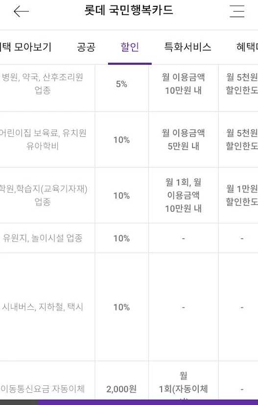 그런데 딱 하나! 할인한도가 훨씬 높은 택시비 할인카드를 찾게 되었습니다. 바로 롯데 국민행복카드였습니다. 이 카드도 기본 전월실적 30만 원 이상이 되어야 할인혜택을 받을 수 있긴 합니다. 하지만 30만 원 이상을 충족하면 전월사용금액의 5%가 무조건 할인한도가 됩니다. 즉 30만 원을 쓰면 1만 5000원, 50만 원을 쓰면 2만 5000원의 할인한도가 되는 거죠. 100만 원을 쓰면 5만 원 할인을 받을 수 있고요.