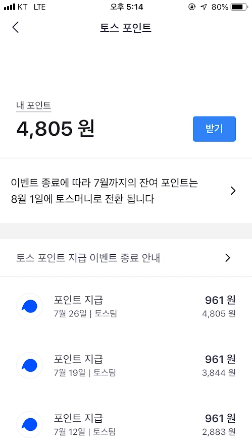 게다가 이 기간 토스머니에 잔액이 모자랄 때 10만 원씩 자동충전을 하도록 설정해두면 매주 961원의 포인트도 준다. 이 포인트 금액이 4805원이었다. (그런데 아쉽게도 이 이벤트는 7월 말로 종료되어 지금까지 적립된 포인트는 8월 1일 토스머니로 전환해준다고 한다.)