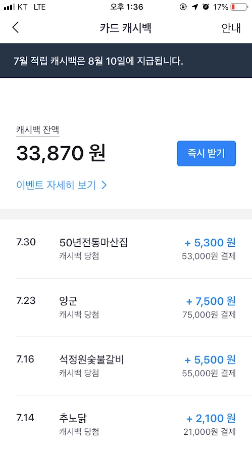 그런데 아쉽게도 1/3 확률로 캐시백 10% 적립 이벤트와 자동충전시 매주 961원 포인트 지급 이벤트는 7월을 끝으로 종료되었다. 하지만 너무 아쉬워할 일은 아니다. 8월부터 시작되는 새로운 혜택이 있기 때문이다.