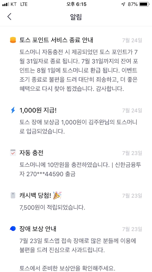 게다가 토스는 7월 중 어느날 잠시 접속 장애가 발생한 적이 있는데, 그 장애보상금으로 1000원을 입금해주었다.