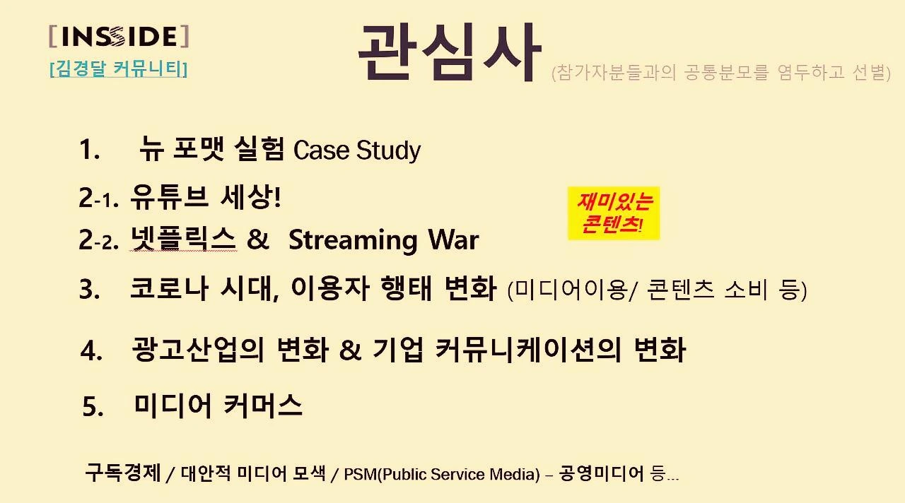 초기에 '김경달의 관심사'라는 PT자료를 작성해 공유하고, 우선순위도 가리고 집담회 주제 선정도 할겸 카톡 투표를 실행했다. OTT 관련 이슈가 가장 선호가 높았다.