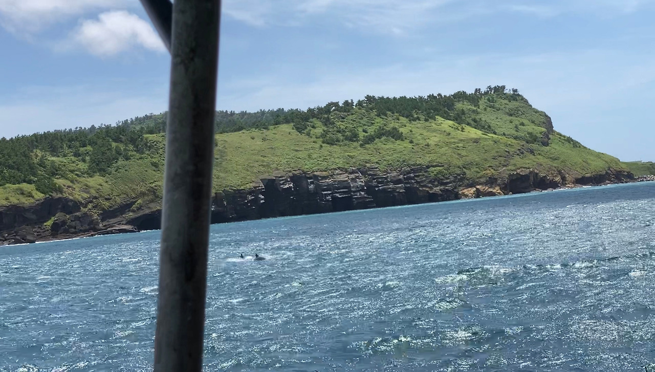 사진이라 잘 안 보이지만 돌고래 3마리가 우리 앞을 지나갔다. 제주도를 여러 번 왔지만 자연산 돌고래를 바다 한가운데에서 보는 기분은 마치 외계인을 만나면 이런 기분이겠더라!!