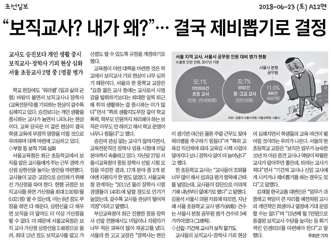 신문은 "학교 현장에도 '워라밸'(일과 삶의 균형) 바람이 불면서 보직교사나 장학사(교육전문직)를 기피하는 현상이 갈수록 심해지고 있다...교육 당국은 이 같은 현상이 결국 학생 교육에 부정적 영향을 미칠 것으로 우려하며 대책 마련에 고심하고 있다" 고 적었는데 기사를 보면 대책보다는 보직교사 등을 기피하는 교사들을 향한 우려(feat.질책성) 담긴 목소리를 지면의 상당부분에 할애한다.