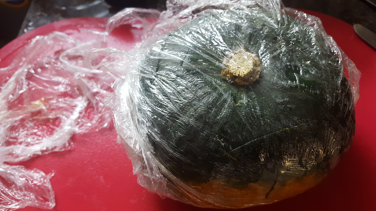 - 속을 파낸 단호박을 랩으로 싸서 전자레인지에 5~6분 삶음.