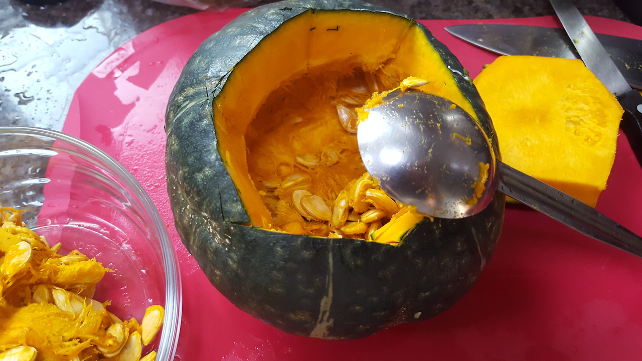 = 씨말고 살을 다 발라내면 나중에 단호박갈비찜에서 먹을 단호박이 없으므로 씨만 살살 발라냄.