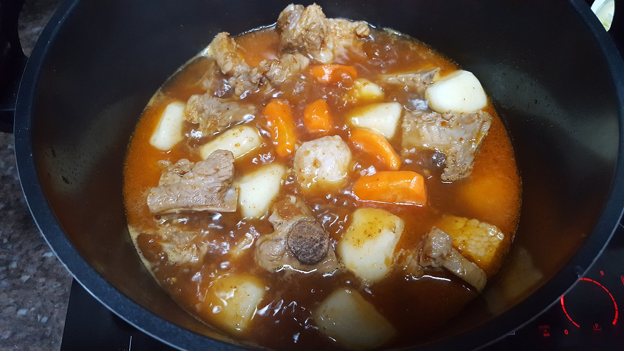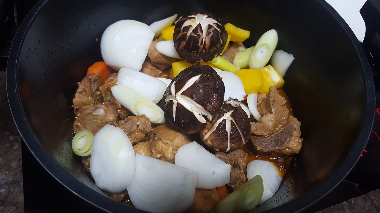 - 고기와 감자, 당근을 넣고 끓인 냄비에 양파와 파프리카, 대파, 버섯을 넣고 10분 더 끓임. 양파까지 모두 익으면 일반(?)돼지갈비찜은 끄읏