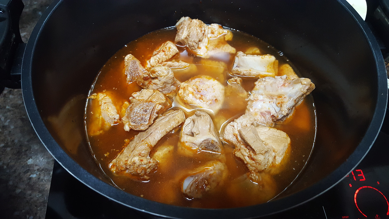 - 재운 고기를 깊은 냄비에 넣고 물 3컵(종이컵)을 넣은 뒤 뚜껑을 덮고 중불에 20분 끓임