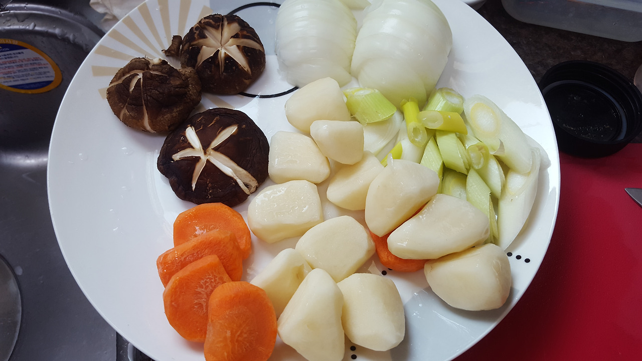 - 감자와 당근은 깍뚝썰끼, 양파는 채썰기, 대파는 어슷썰기, 표고버섯은 기둥을 떼고 칼집 모양을 내 준다
