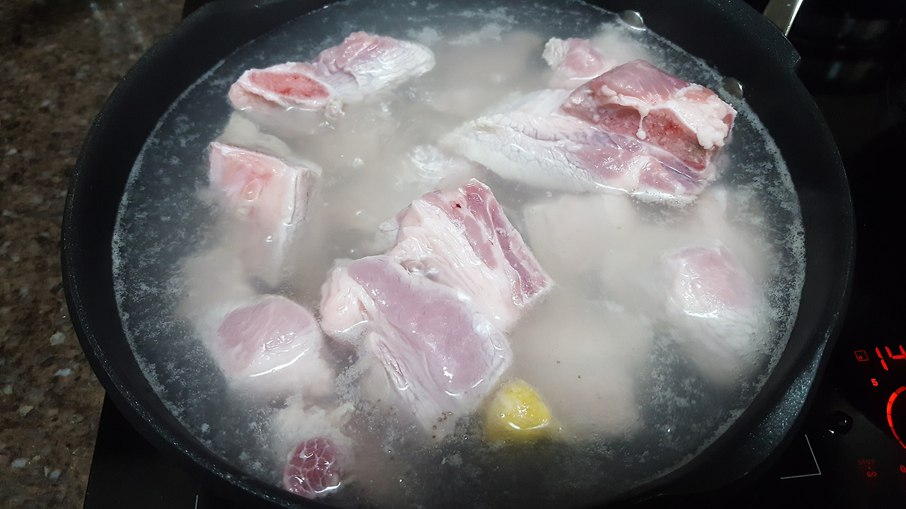 - 끓는 물에 핏물을 뺀 돼지고기를 넣고, 2분 정도(고기 겉면만 익을 정도로) 삻음.