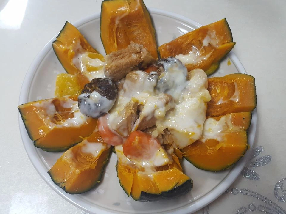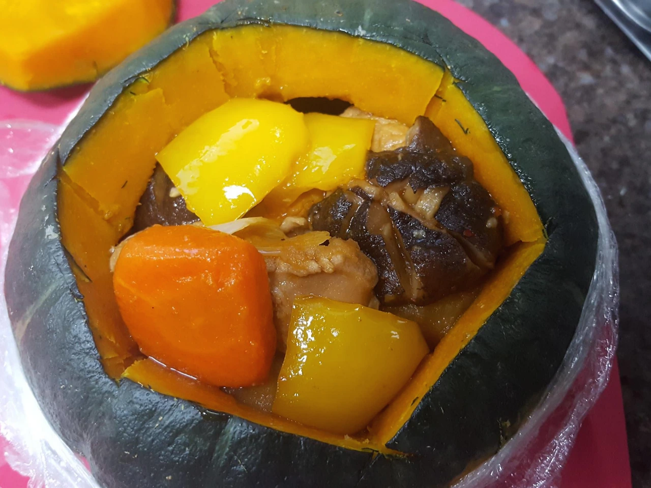 - 완성된 갈비찜을 단호박 안에 넣은 뒤 호박 뚜껑을 닫고 랩으로 싼 뒤 전자레인지에 넣고 3분 돌림