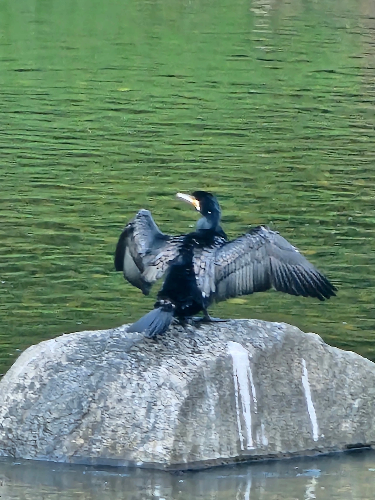 하천 쪽으로 눈을 돌리니, 바위 위에서 가마우지가 날개를 펼치고 햇볕을 쬐고 있었다. 물고기를 잡은 후 젖은 깃털을 말리는 모습이 인상적이었다.