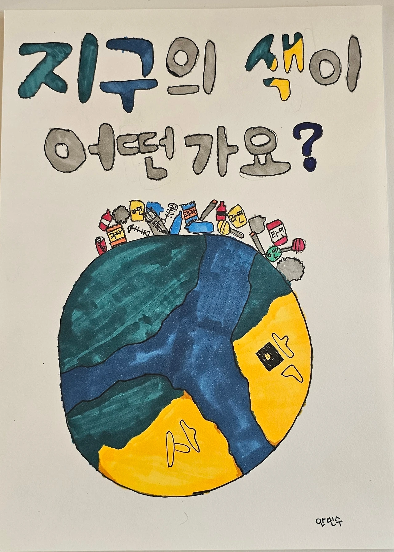 6학년 아이는 지구 위에 수많은 쓰레기를 그려 넣었습니다.