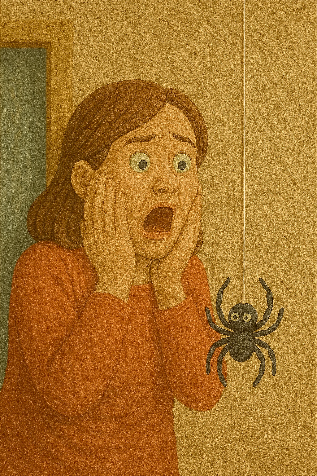 기다란 거미줄을 타고 아래로 쓱 내려온 거미를 본 엄마는 꺄악 소리를 지르며 아빠를 부르러 갔어.