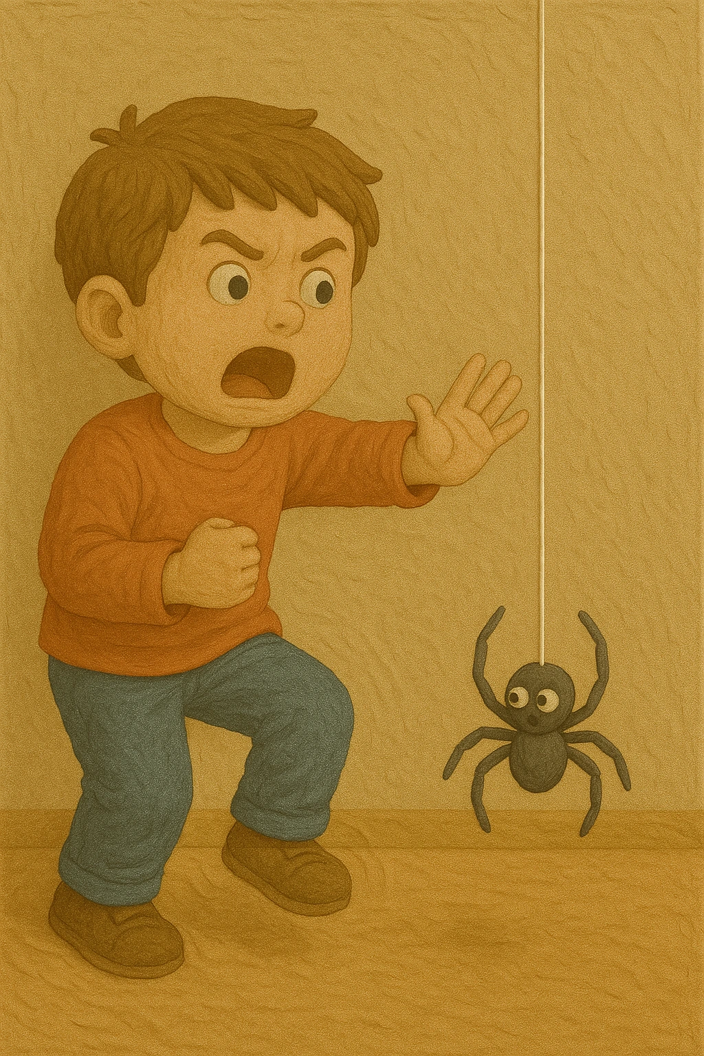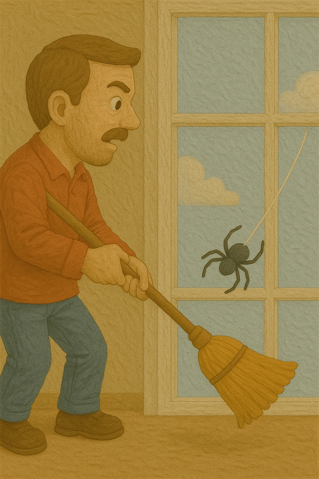 아빠가 다가와 날 옆으로 밀치더니 무시무시한 빗자루로 거미가 타고 있는 거미줄과 거미를 같이 낚아채서 베란다 밖으로 털어 버렸어. 거미가 살았는지 죽었는지 알 수 없었지.