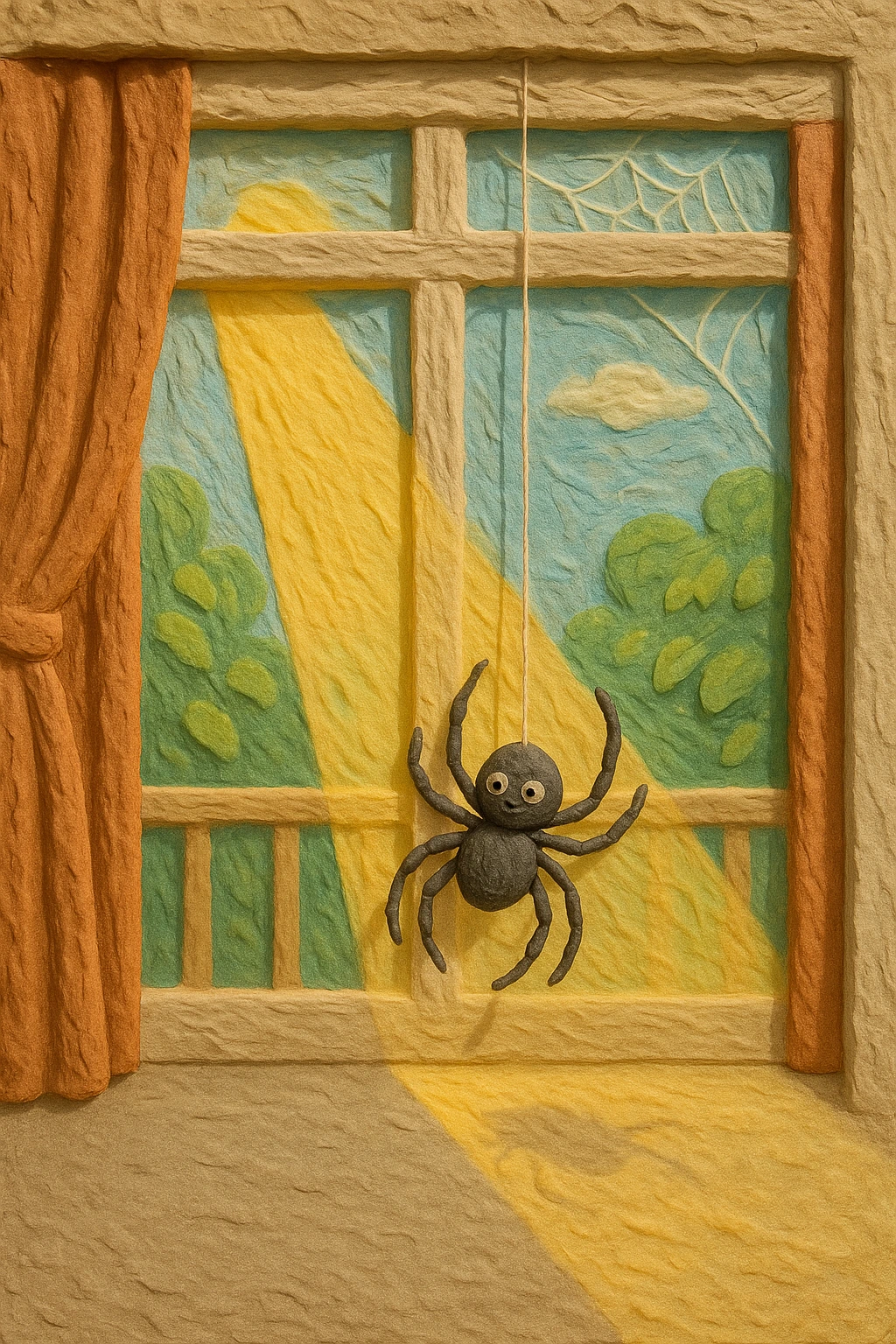 따뜻한 햇살이 비치는 베란다 창의 거미 한 마리가 쪼르르 내려와 대롱대롱 매달려 바람그네를 타고 있는 걸 봤어.