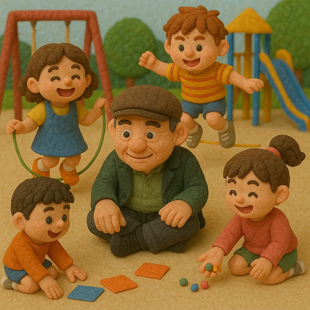 아저씨가 웃으며 딱지를 꺼내자, 아이의 눈이 반짝였다. 둘은 벤치 앞에서 딱지치기를 시작했고, 놀이터의 다른 아이들도 그 모습을 보고 하나둘씩 모여들었다.