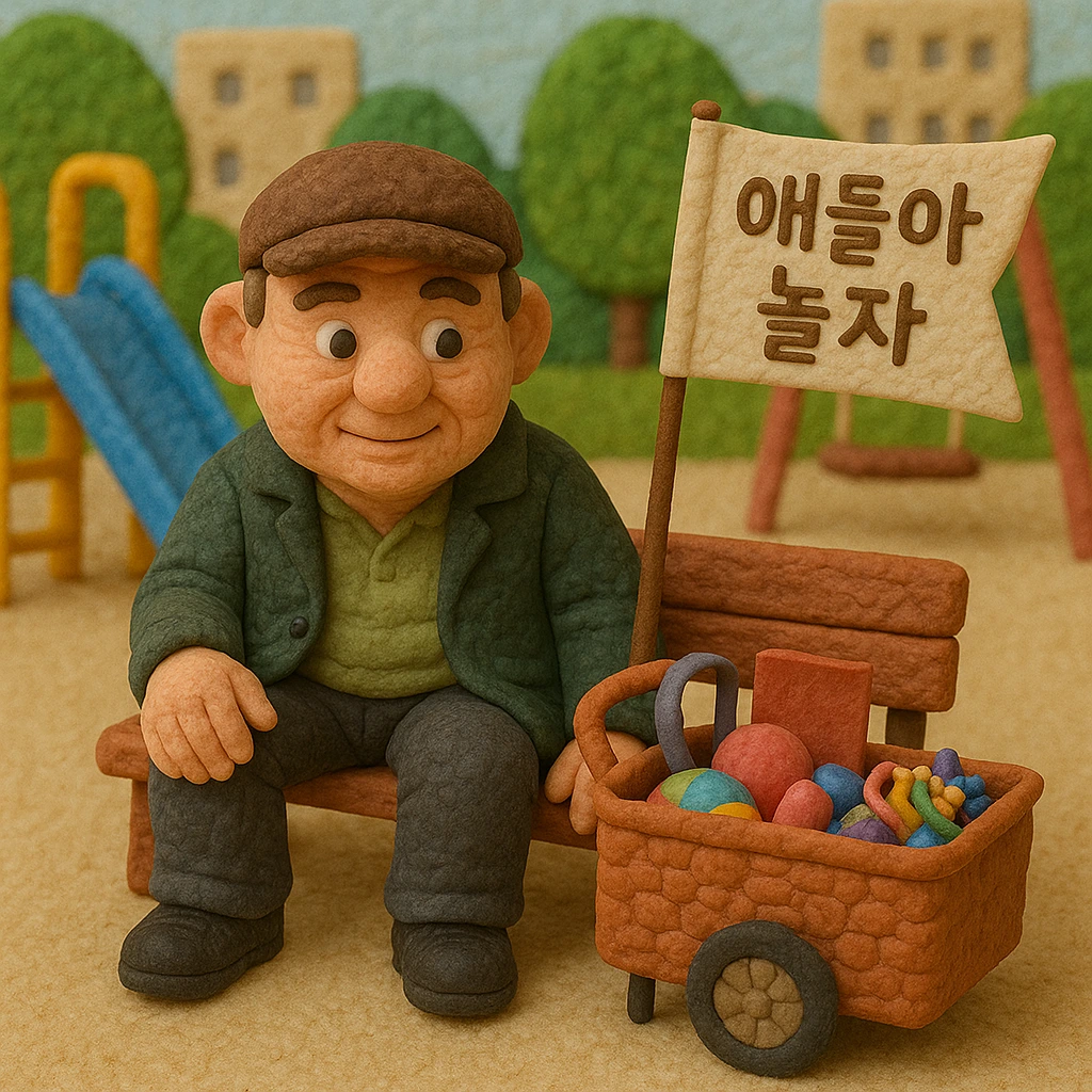 동네 놀이터 한쪽 벤치에 수상한 아저씨가 리어카를 끌고 와 앉아 있었다. 리어카 안에는 딱지, 공기놀이 세트, 줄넘기, 고무줄 같은 다양한 놀이 도구가 가득 실려 있었다. 게다가 리어카에는 ‘얘들아 놀자!’라는 깃발까지 펄럭이고 있었다.