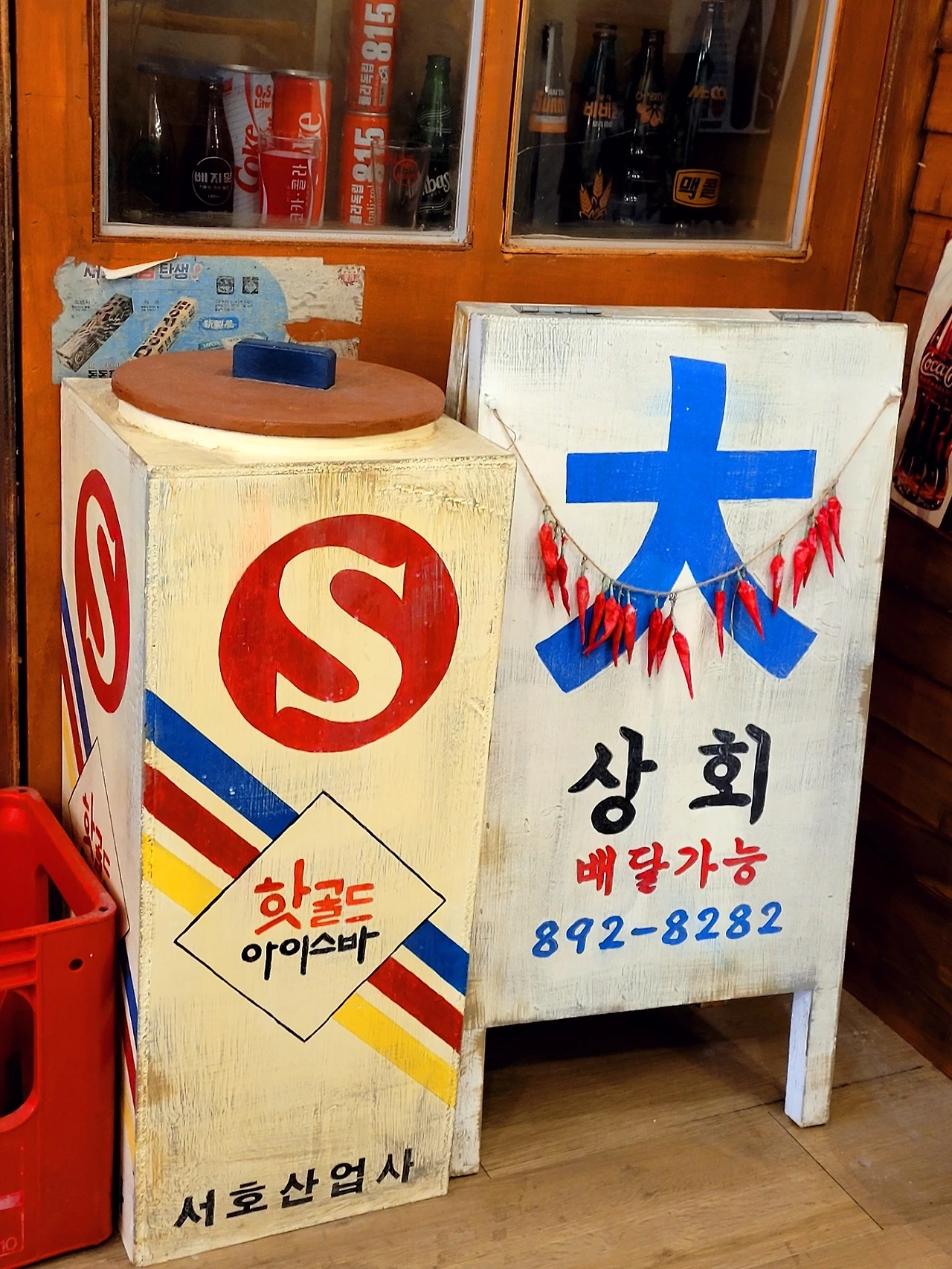 울 엄마가 맨날 보던 빨간색 텔레비전. 그 위에 못난이 인형에 동네 구멍가게 하드 통까지.