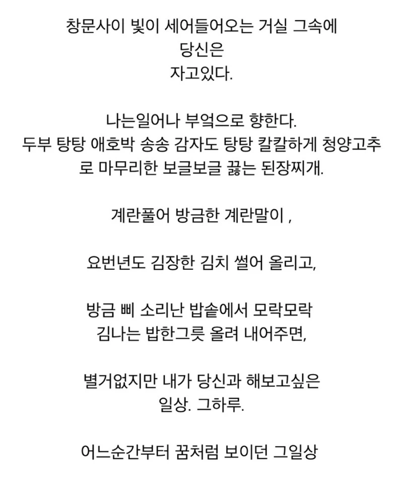 2013년도 내 나이 21살, 9년 전 내가 당신을 생각하며 썼던 글인데 정말 말하는 대로 되는구나. 오늘 하루 종일 열심히 밥을 지었다. 주말에 나가지도 않고 밥 차리고 잠자고 일어나서 밥 차리고 그러다 보니, 지금 이 시간 헐. 진정 밥순이가 따로 없네. 하지만 난 밥순이 좋아. 내가 당신을 위해서 밥을 차려주고 당신은 내가 해준 밥을 맛있게 먹잖아. 그럼 됐지.