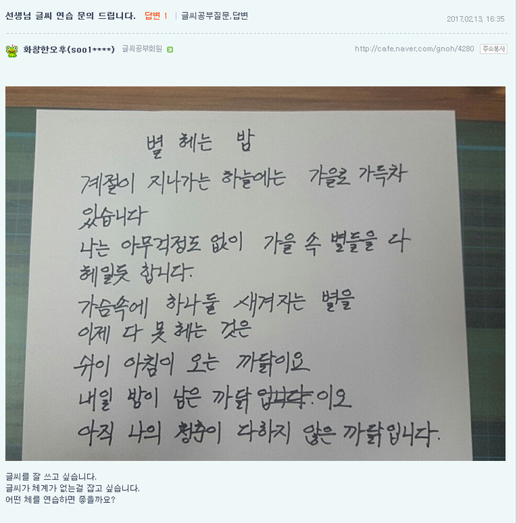 지도해주시는 선생님께 저의 필체를 문의하고 조언을 구했습니다.