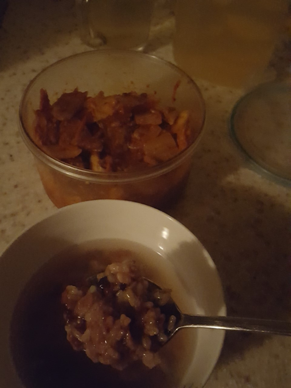 반찬이라고는 볶은 김치 하나, 목구멍에 잘도 넘어갑니다