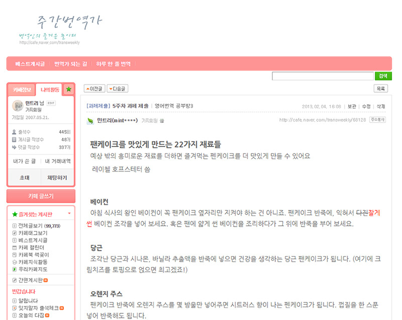 카페 회원분께서 번역 스터디를 할 수 있는 웹페이지를 개발하셔서 거기에서 참여했던 기억이 난다. 자료는 거의 남아있지 않네. 이때는 다양한 종류의 글을 번역할 수 있었다. 팬케이크 조리법, 경제 기사, 스티브 잡스의 졸업 연설 등. 소설이나 에세이와는 다르게 숫자, 단위, 인명, 지명 등을 정확히, 일관성 있게 옮겨야 하는 것이 많아서 그 부분을 보완했던 것 같다.