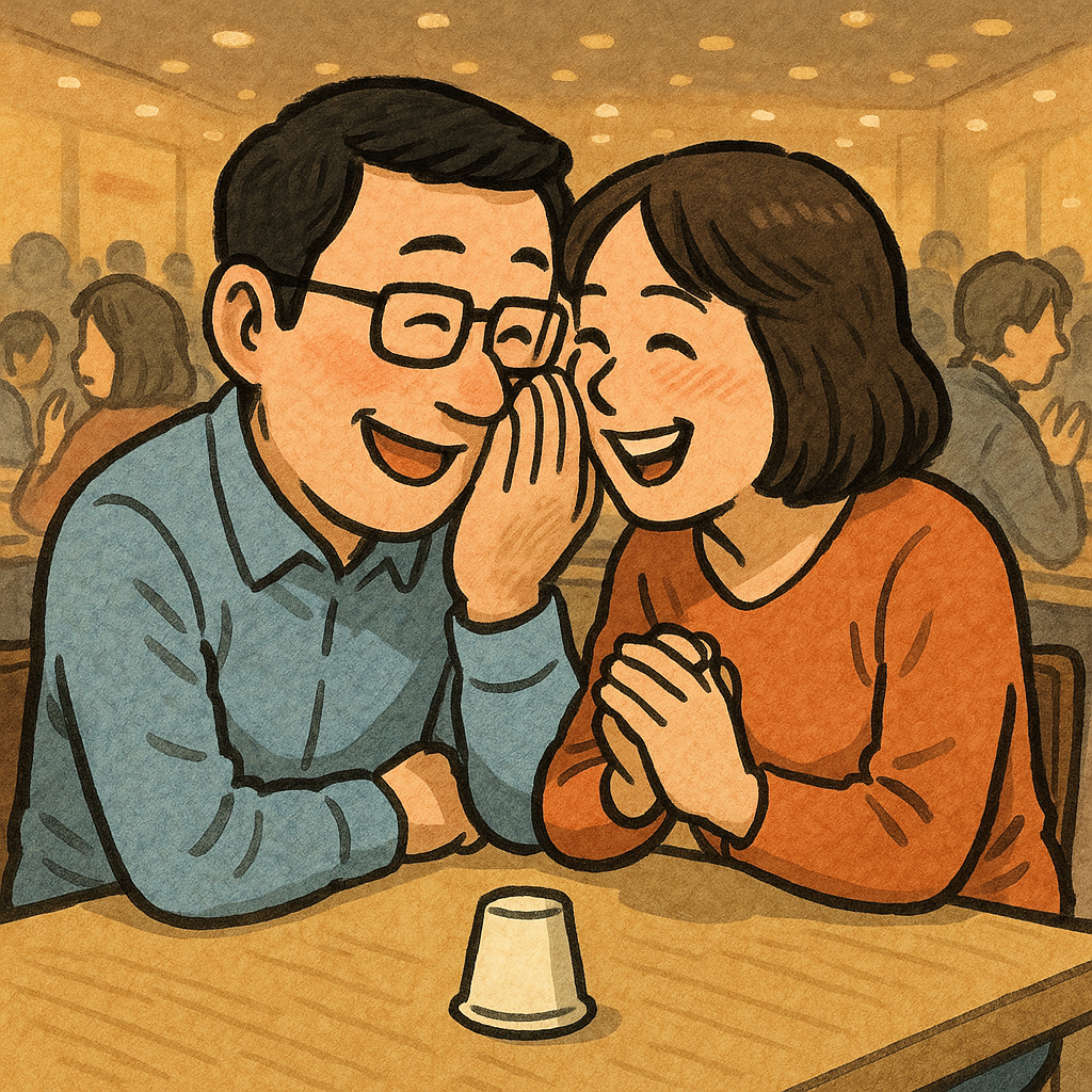 "여보, 식당에 사람이 많으니깐 웅웅 거리는 소리가 심하네."