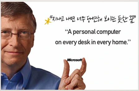 지금은 당연하게 사용하고 있는 퍼스널컴퓨터도 마이크로소프트 빌게이츠의 "모든 가정에 하나의 컴퓨터를"이라는 비전으로부터 실현되었다고 볼 수 있다. 내가 처음 직장생활을 할때만 하더라도 지금 개인이 가진 휴대폰에서 작동되는 컴퓨터 보다 낮은 성능과 용량의 컴퓨터를 기업에서 그것도 여러 명이 공유하면서 사용했다. 지금은 그 보다 훨씬 성능이 좋고 큰 용량의 컴퓨터를 집집마다 여러 대 갖고 있을 뿐 아니라 개개인이 포켓에 넣고 다니는 세상이 된 것이다. 이 또한 누군가의 비전에 의해서 그렇게 된 것이다.