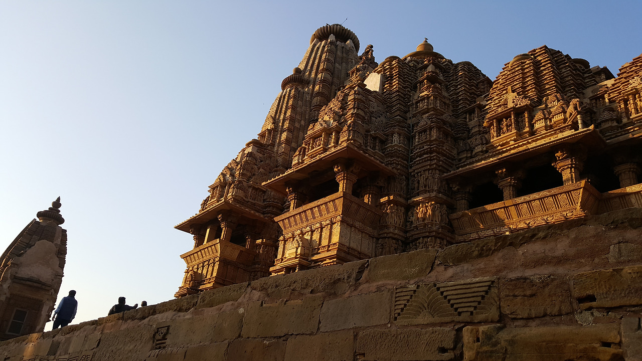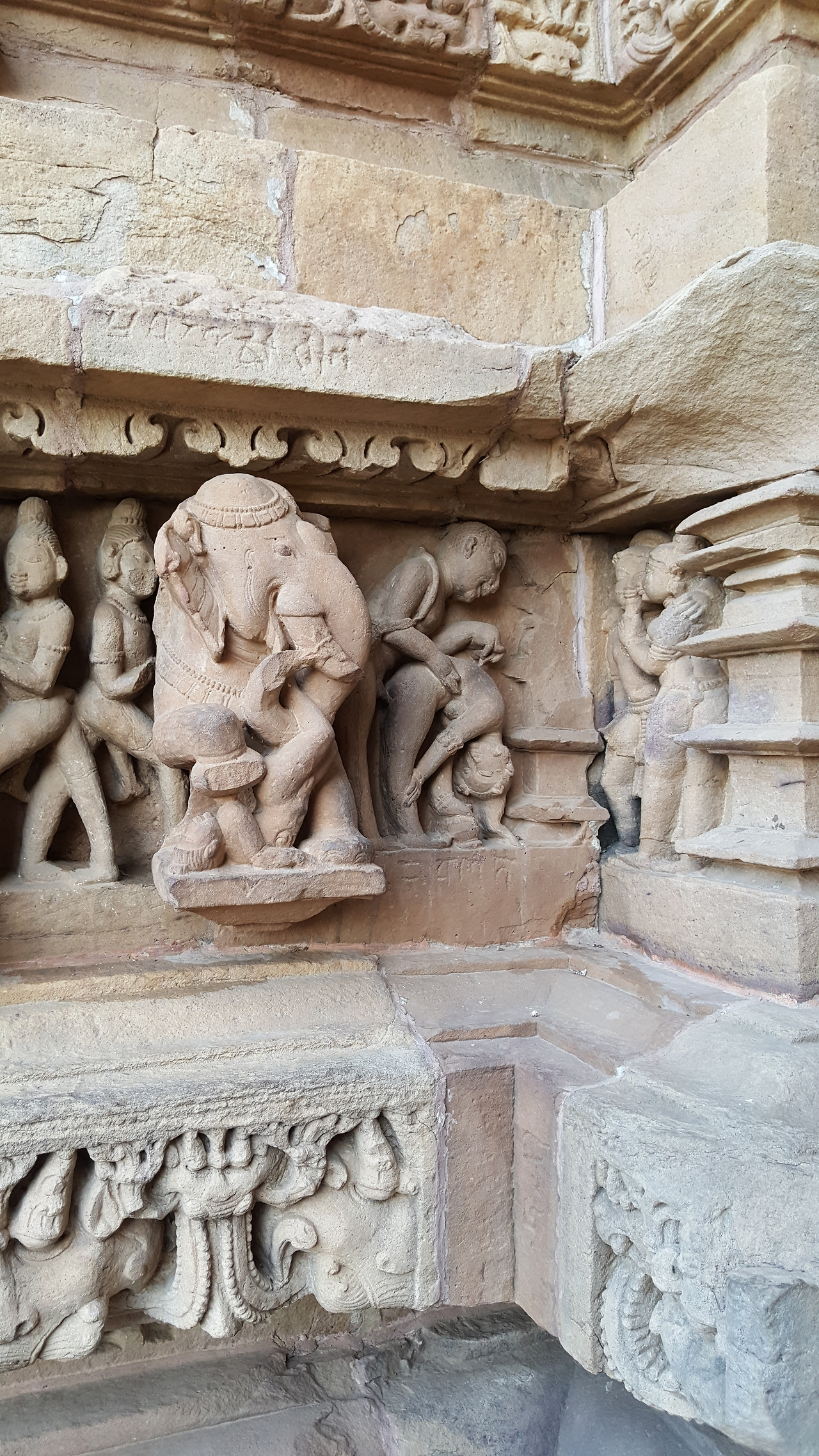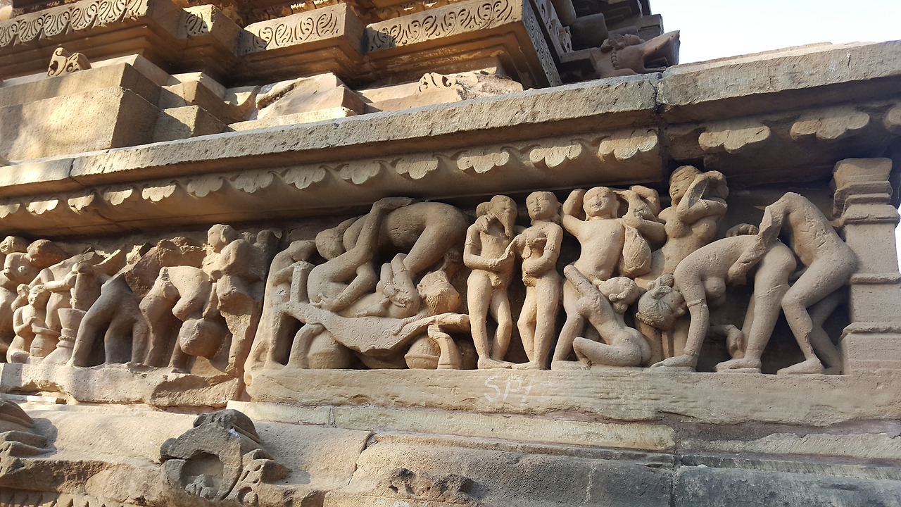 이곳 사원 외벽에는 다양한 형태의 애로틱한 조각물이 새겨져 있는데 인간이 상상할 수 있는(또는 없는) 모든 성행위를 묘사하고 있었다. 심지어는 수간까지 묘사한 조각물도 있었다. 이런 낯뜨거운 성행위를 묘사한 조각을 한 이유는 대해서는 여러가지 설이 있는 것 같다. 당시 유행한 탄트리즘(80년경부터 일어난 힌두교의 퇴폐적인 경향)의 영향이라고 하는 설이 더 설득력 있어 보이는데, 가이드의 설명에 따르면 당시 자이나교가 번창하면서 금욕을 강조하고 출가를 많이 하게 되자 인구의 축소를 걱정한 왕들이 사원벽에다 그와 같은 형상의 모습을 새겨놓음으로써 출산을 장려하기 위해서였다고 한다.