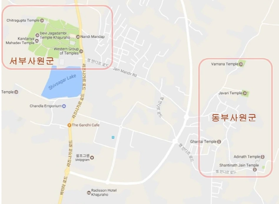 전체는 서군과 동군으로 나눠져 있는데 서군은 힌두사원, 동군에는 자이나교사원이 있다. 대부분의 사원은 서군에 집중되어 있다.