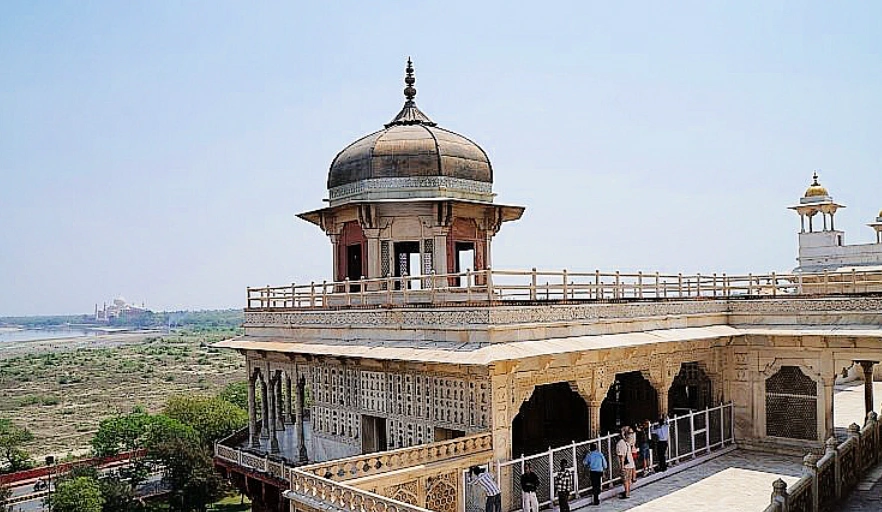 이어서 샤자한황제가 타지마할을 짓고 난 뒤 재정난에 빠져 있는 동안 막내아들 아우랑제브의 반역으로 유폐가 되어 있던 아버지 샤자한의 감옥(무산만 버즈탑)을 관람하면서 타지마할을 바라보며 마지막을 보냈던 샤자한의 심정을 생각하며 우리들도 건너편에 보이는 타지마할을 배경으로 몇 컷의 사진을 남겼다.