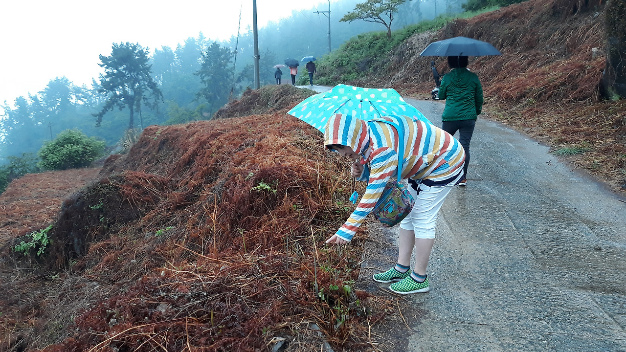 안개가 자욱하여 앞을 분간하기도 힘들고 추적 추적 내리는 비로 인해 물로 흥건한 산길 4키로를 묵묵히 걸었다. 우산을 받쳐 들긴 했으나 바람을 동반한 세찬 빗줄기가 몸 속으로 스며들면서 시작한 한기로 인해 애초 예상한 우중 속의 정취는 출발할 때 잠시 외에는 오직 목표지에 도달할 생각 만을 하면서 질퍽이는 진흙길을 걸었다.